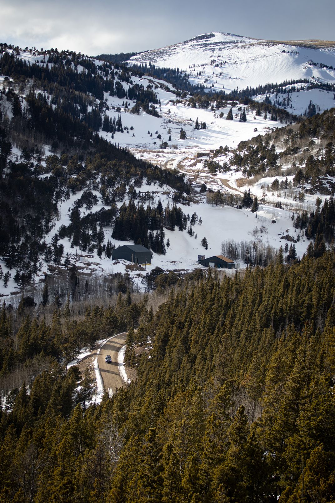 A car speeds downhill after a day in the mountains.