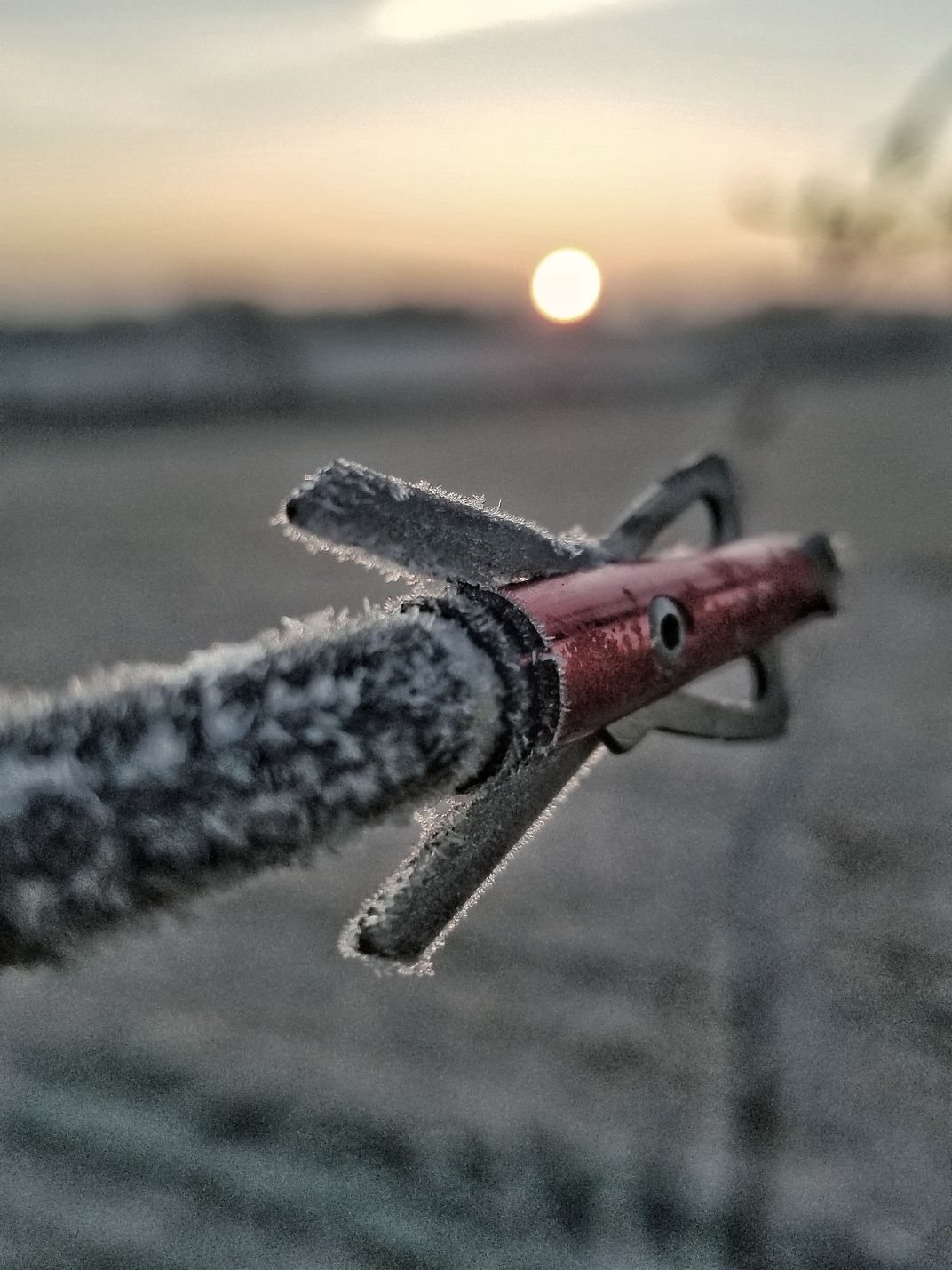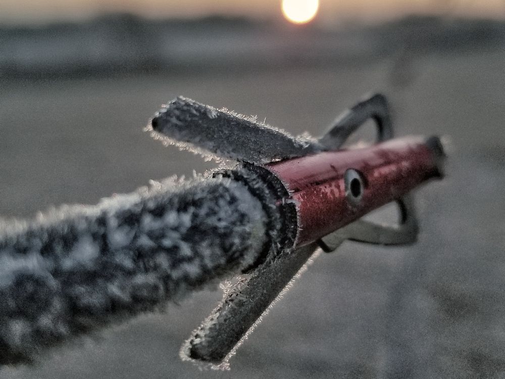 The photo is showing the frost on a Rage broadhead just after the sunrise. The frost this morning was intense. Coldest morning hunt this year.