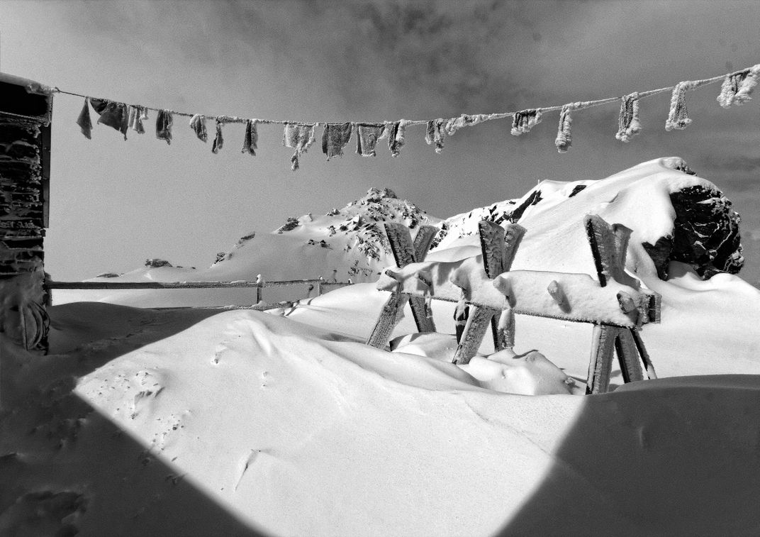 frozen flags outside of the Glungezer Hütte over Insbruck in Austria
