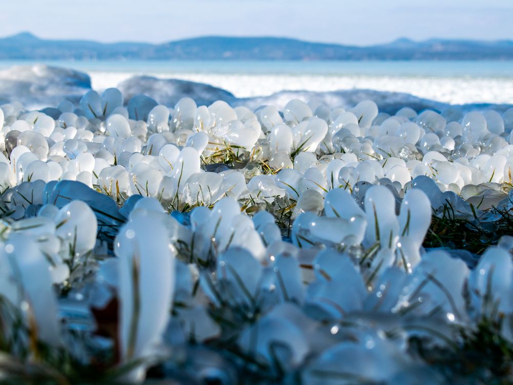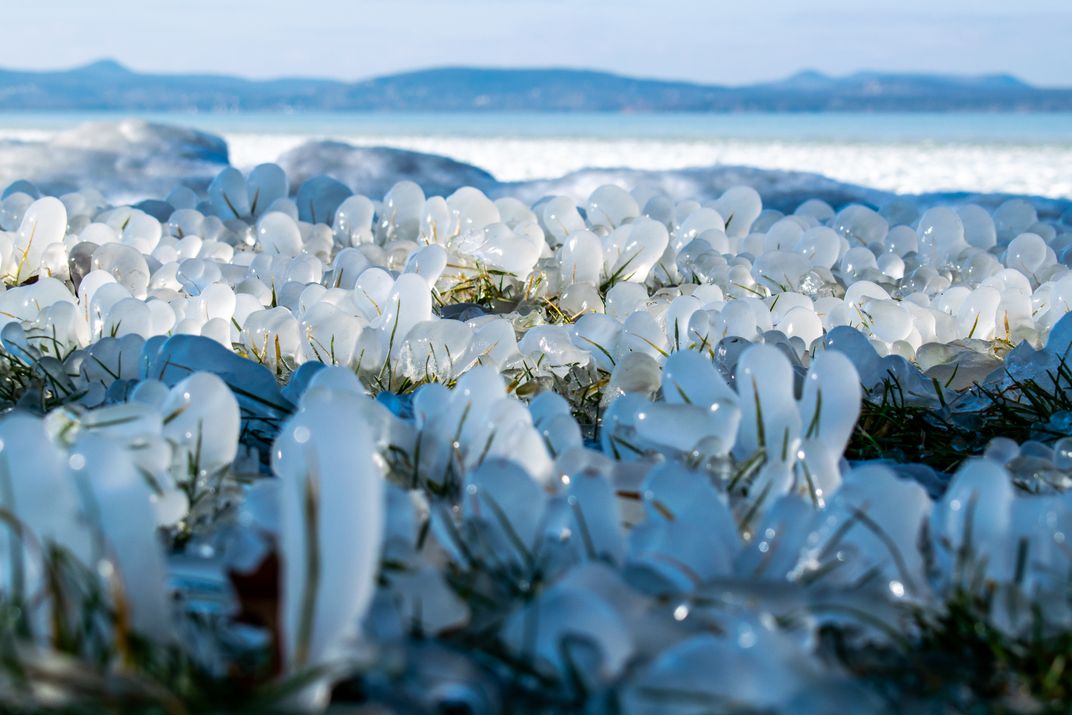 Winter on the beach of the Lake Balaton is a magical time. The splashing waves often create beautiful ice sculptures all around. A few times every year round ice balls appear everywhere, often hiding one single grass inside them. Otherworldly.