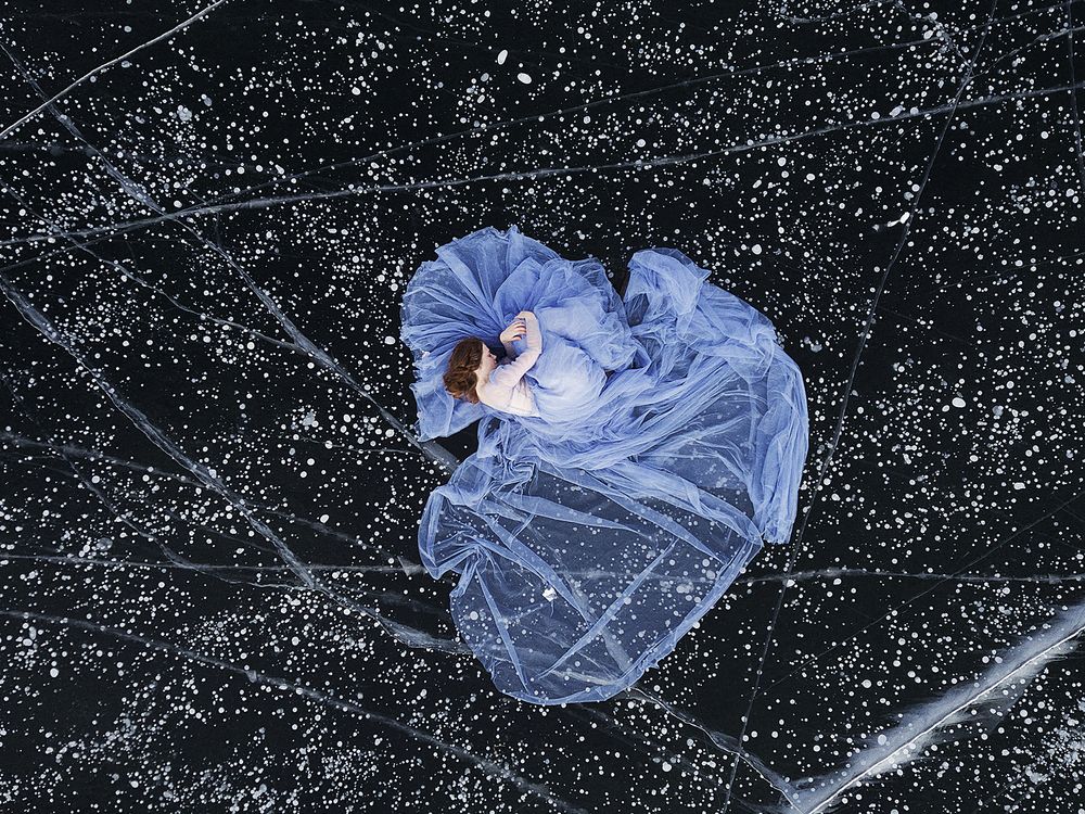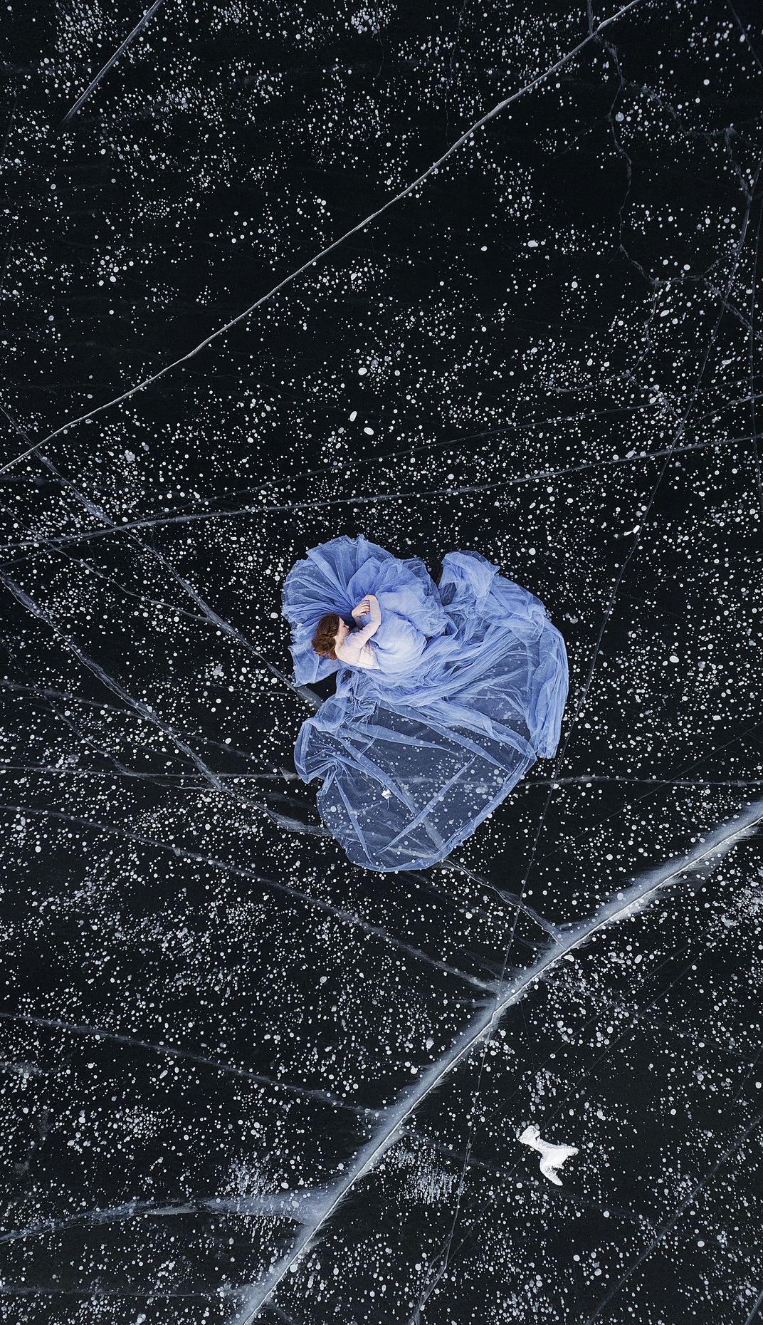 Woman lying on frozen ice of Lake Baikal Taken in January, 2022