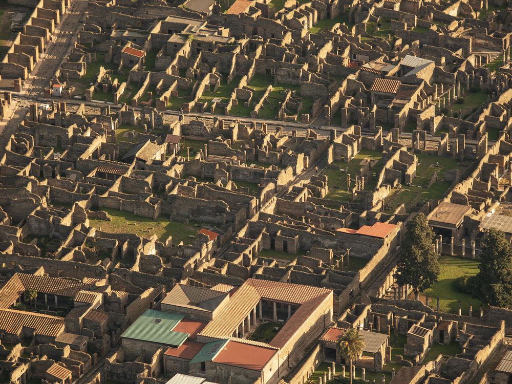 Captured from a plane over Pompeii, the city’s ancient grid of streets and ruins forms intricate patterns against the earth—look closely and tiny tourists move through the echoes of a world frozen in time.