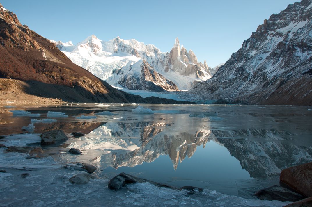 Frozen lake reflection at the Cerro Torre, Fitz Roy, Argentina