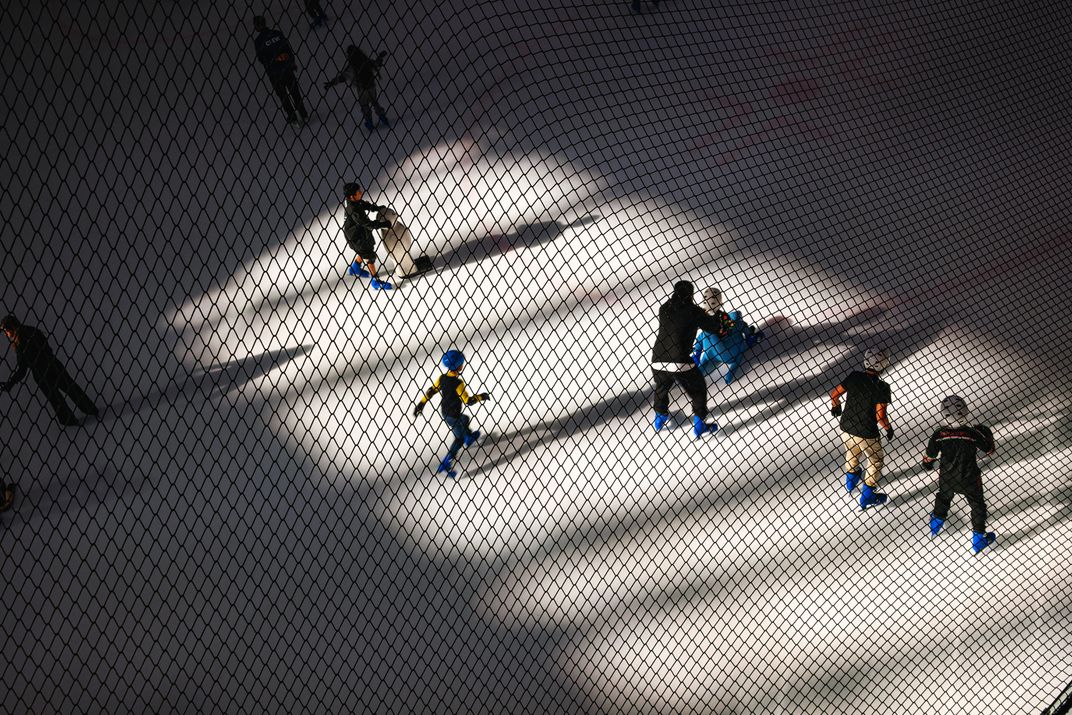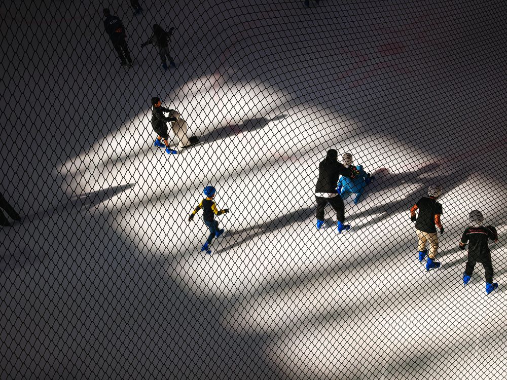 Skaters move through a bright patch of sunlight on an indoor rink, seen through the pattern of a protective net. The mix of shadows, motion, and graphic lines creates a striking contrast between chaos and control.