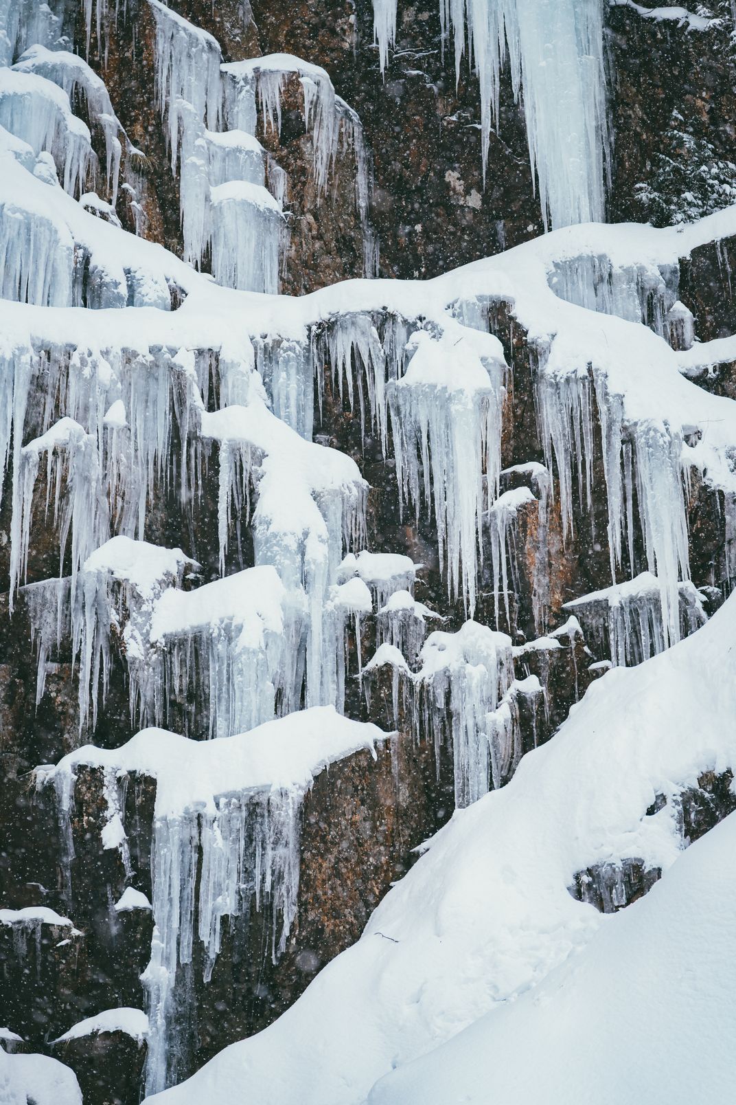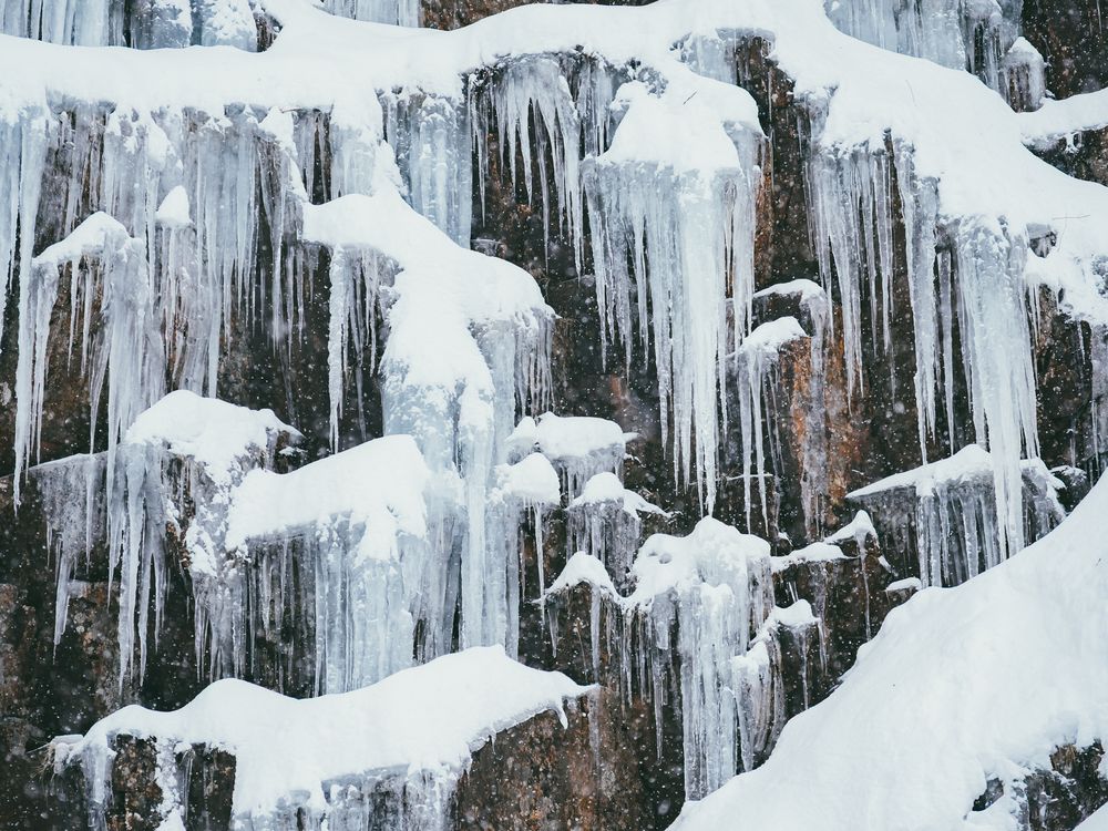 Winter’s tight grip on Franklin Falls, captured Feb 16, 2025. Thousands of sharp icicles cling to the rock face, forming a dramatic natural sculpture amidst the falling snow of a deep freeze.