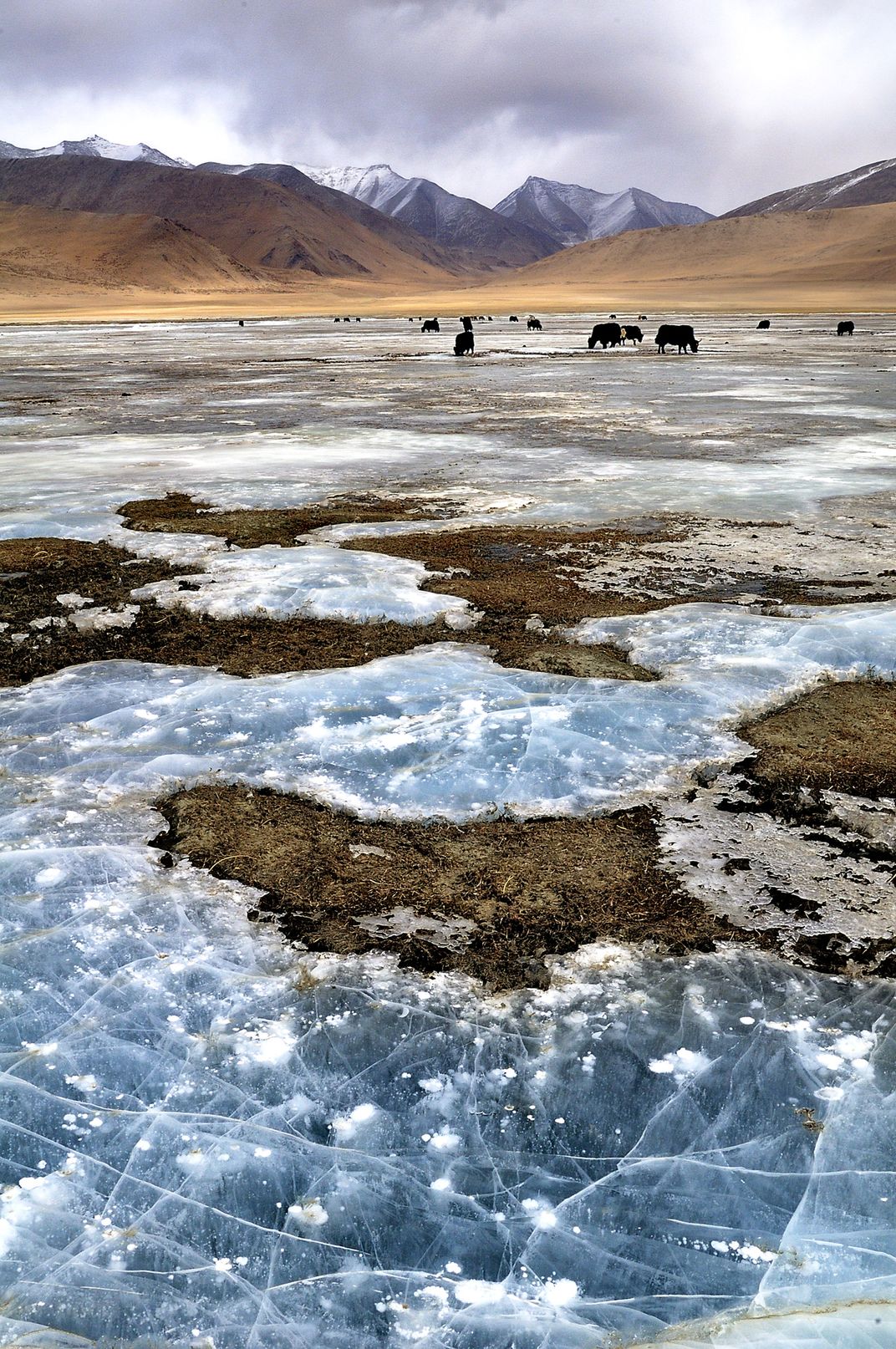 frozen waters of tsokar lake in ladakh, with yaks grazing on the far bank