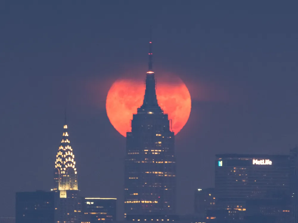 Full Blood Moon setting behind the Empire State Building