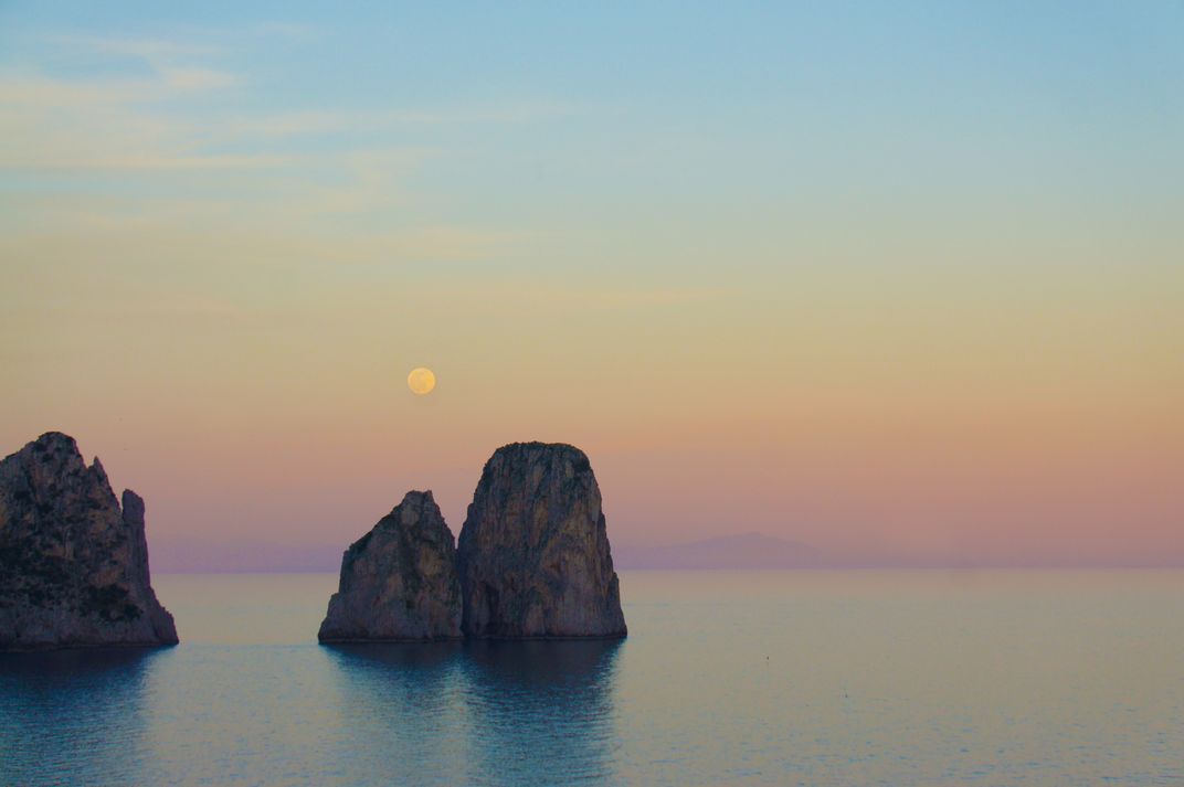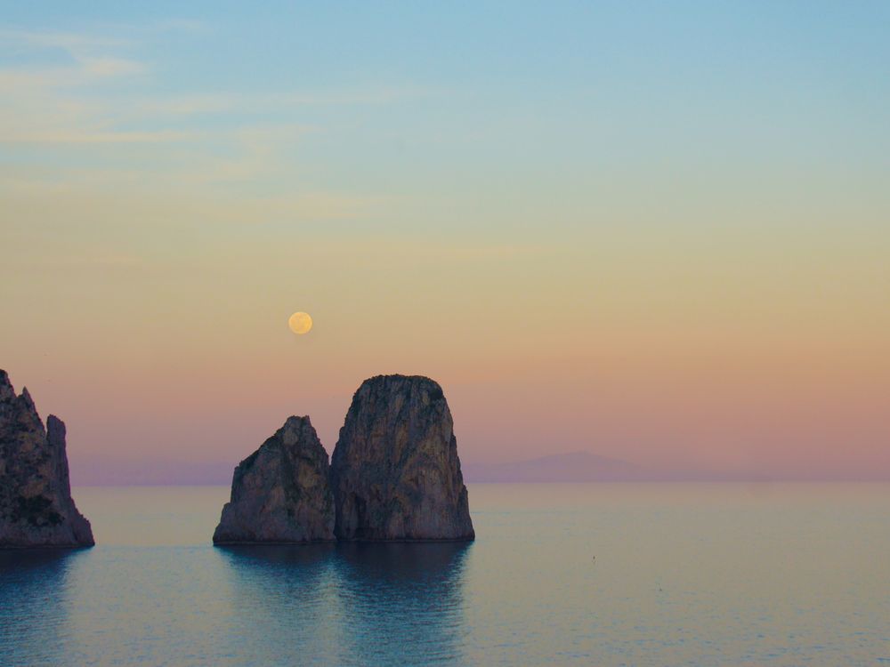 On a cross-Europe traveling extravaganza, my sister and I found ourselves on the Island of Capri off the coast of Italy at the start of May. For our first night, we had dinner outside at our hotel, which had a perfect view of the Lover's Arch. Coincidentally, it was also a full moon and a wonderful sunset for our first night in the new place. With the perfect setting we cheers'd and had dinner.