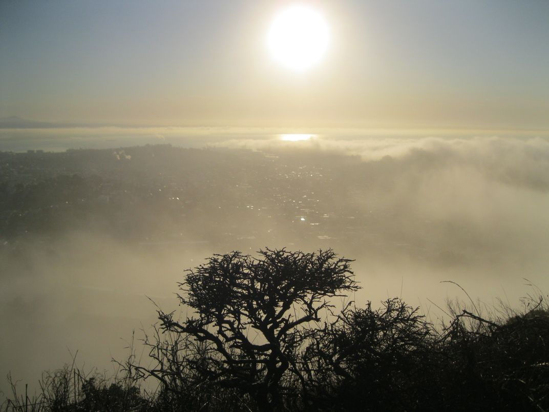 Full sunrise through the fog bank over S.F. Bay silhouetting a Coyote bush.