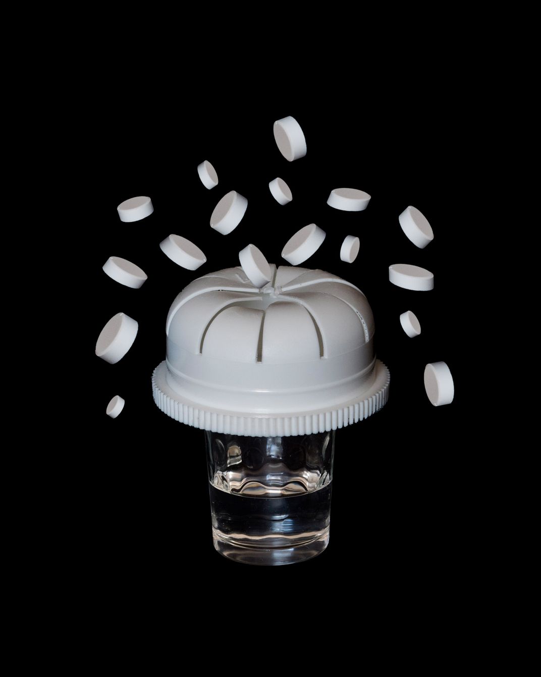 This photo is part of the project called token. in which I created a series of digital collages from photographs of my everyday objects. The idea is to break down these objects usual functions, making you ponder new meanings, about their purpose, how we use them, and our consumption habits. In this image: a glass of water, a lid and my anxiety pills.