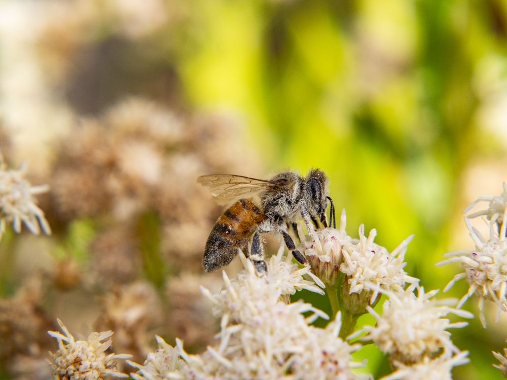 A bee on a flower, covered in pollen as it harvests even more pollen.