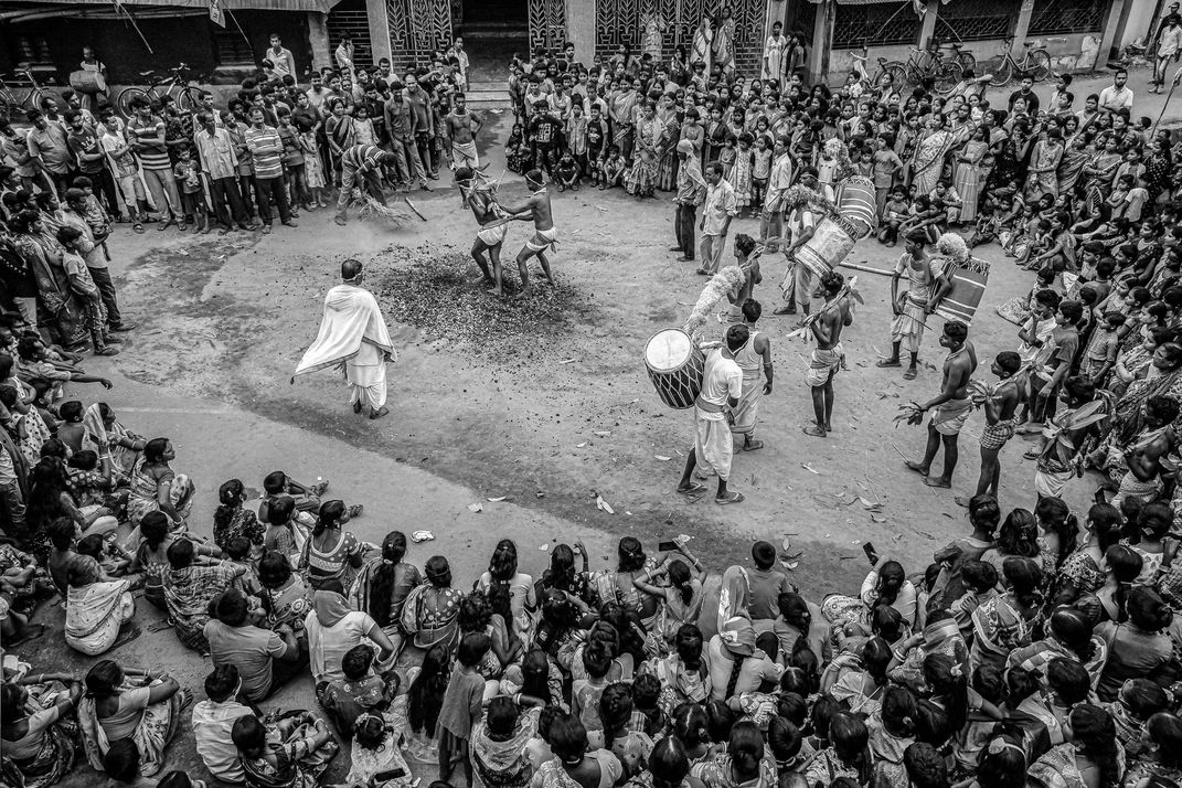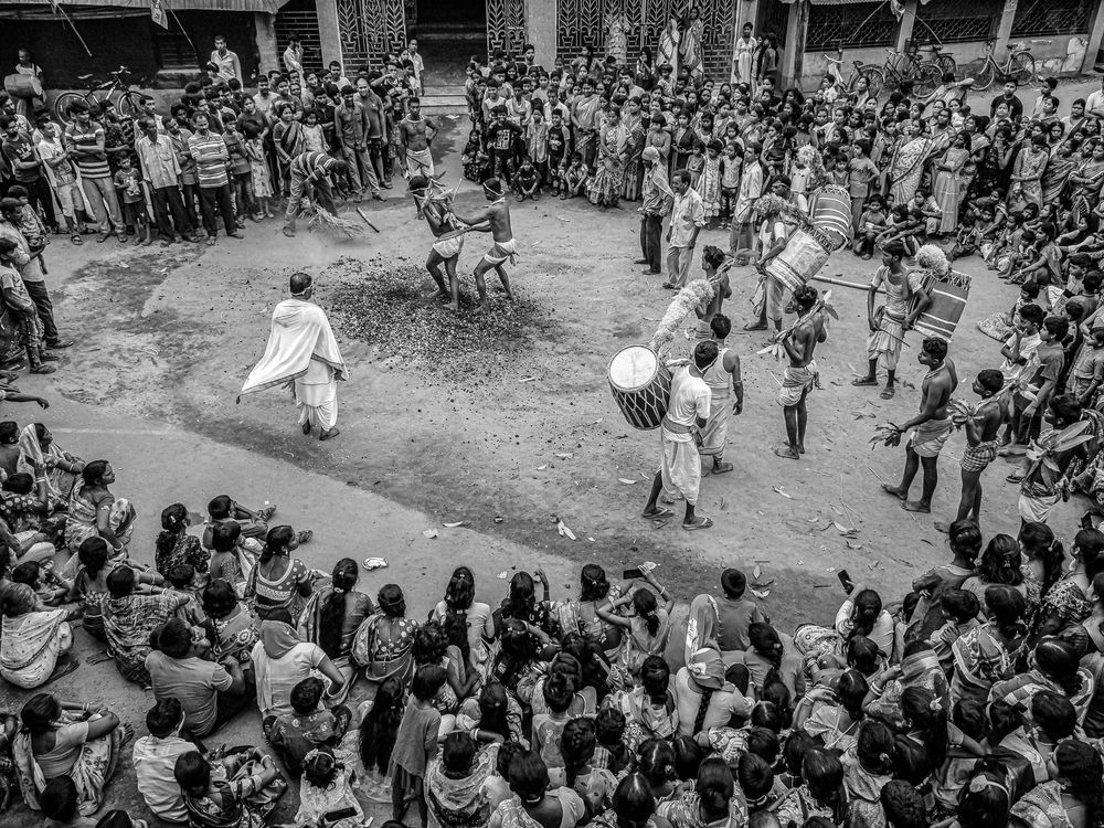 In the sacred dance of flames, devotees surrender to the divine heat of Agun Sonyas during the vibrant Gajan festival, while others patiently await their turn in the queue of spiritual transformation.