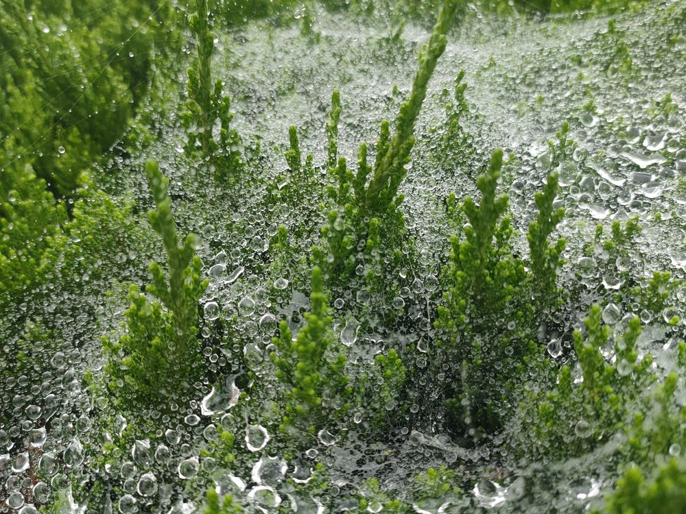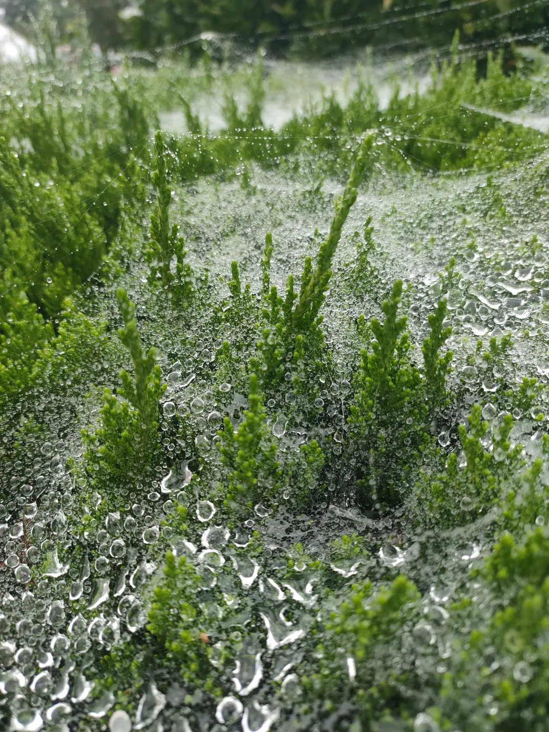 The rain had just ceased, and the world was washed in clarity. Beneath the arched canopy of emerald pine needles, I discovered a masterpiece—woven with spider silk as the warp and raindrops as the weft.Each rounded bead of water, like carefully strung glass or a transparent celestial sphere, hung suspended along silvery tracks. In silence, they refracted both the sky's light and the world below.They had replaced the night's dew, and in these moments after the rain, bestowed a quiet coronation upon this tiny corner of the earth. This was nature's most effortless luxury, a fleeting treasure offered only to the attentive observer—a miniature epic recording the grand narratives of light, gravity, and transient eternity.