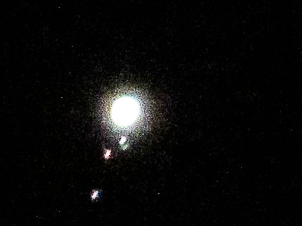 This a cropped original photograph of Jupiter and its 4 largest moons (Galilean Moons). Earlier that day, it was reported on the radio that the 4 largest moons of Jupiter would be visible that night if binoculars were used. That night, the moons were easily visible even without binoculars. When I photographed them, they were positioned in a straight line. They are in order from furthest to the closest to the planet Callisto, Ganymede, Europa and Io. Cropping the original photo magnifies the surface features of each moon and reveals many of the smaller moons.