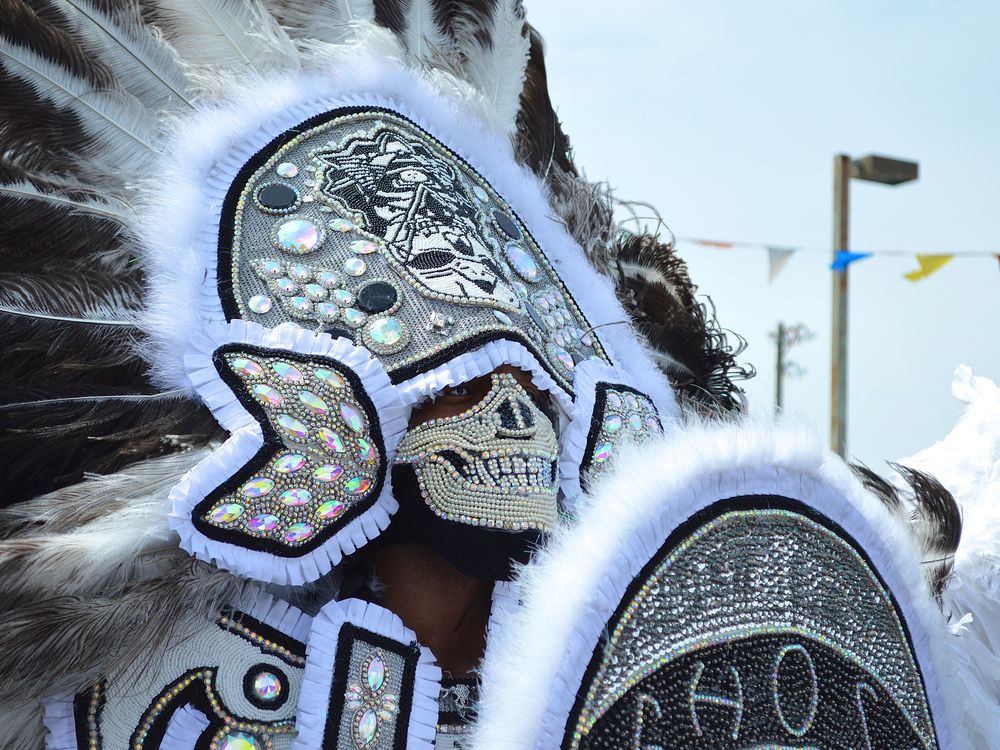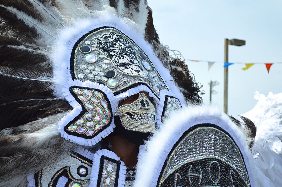 Steve Austin, a member of the Black Mohawks Mardi Gras/Black Masking Indians and also know as Gang Flag Ghost, out on the streets of Uptown New Orleans for Super Sunday.