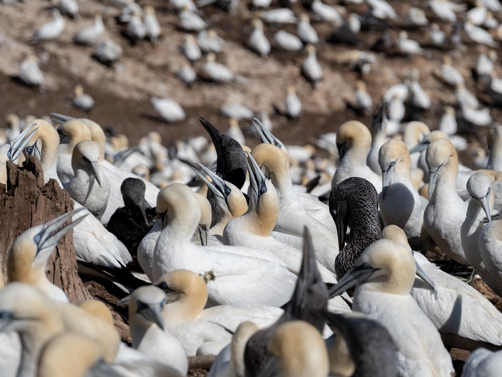 More than 100,000 northern gannets gather to breed, on Ile Bonaventure, off the Gaspe Penninsula in Quebec Province. By the end of October they will have migrated south to warmer climates.