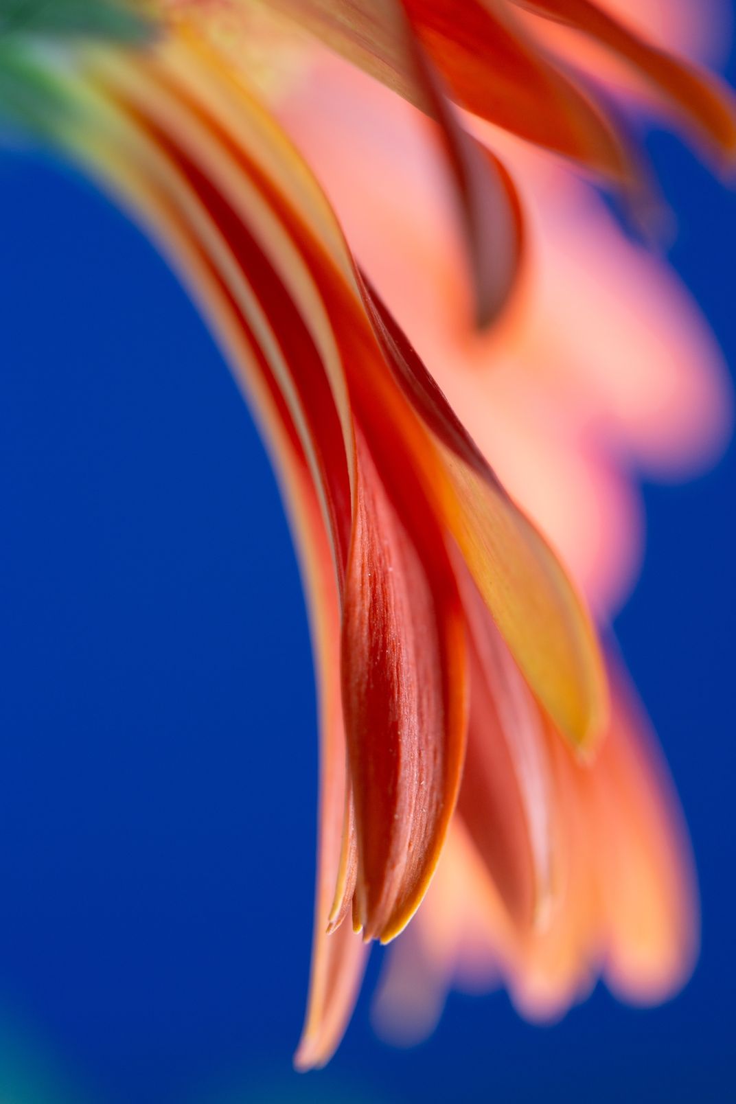 Close-up of a potted plant illuminated with colored lights, set against a blue background enhancing its orange tones. Part of my "Garden of Dreams" series, the image explores the intimate details of nature to evoke a dreamlike reflection of the observer's inner psyche.