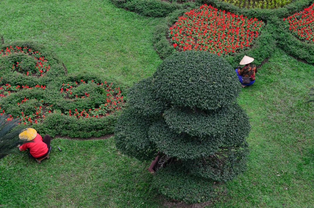 Two gardener working in the Imperial City Thang Long in Hanoi Vietnam. I liked the colour contrast between the green of the grass, the red of the flowers and the jacket of a gardener. Also the recurrent form of the hats of the gardener and the shape of the bonzai tree.