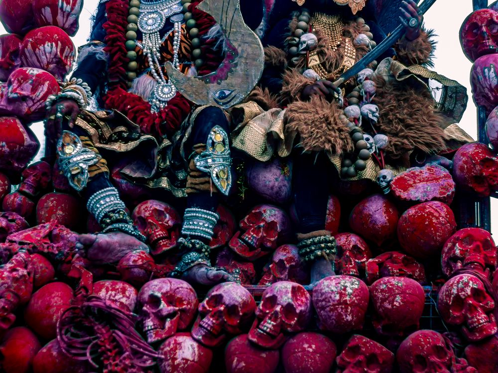 The prominent garland of skulls around Maa Kali's neck represents the cycle of life, death, and rebirth.They also represent the egos of demons she has destroyed. In her hands, she typically holds a scimitar which signify divine knowledge cutting through human ego and illusion to achieve spiritual liberation (moksha).The multitude of the red-colored sea of skulls forming the base of the display emphasizes her association with the cremation grounds (smashana), a place of death, transformation, and liberation from worldly attachments.