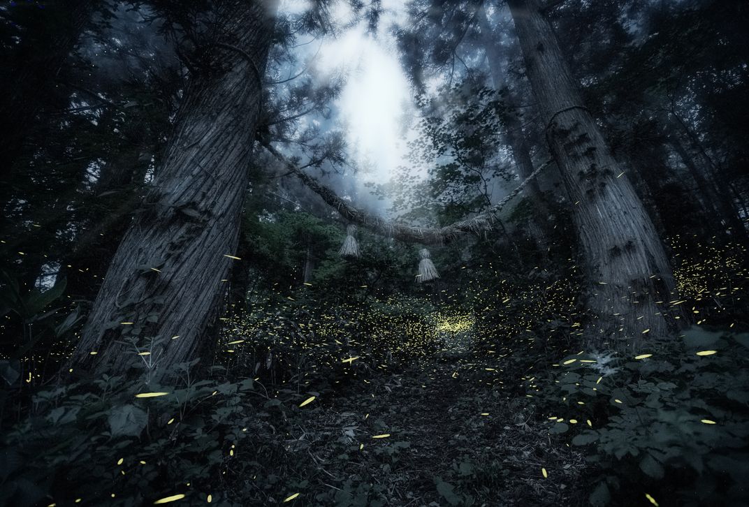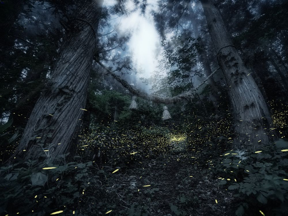 Deep in the forest where no one can enter, wrapped in the dark, you can hear the cry of insects and birds—the whisper of plants brushing against the wind. I feel fear in the darkness of the night. Himebotaru, which is an indigenous firefly species of Japan, fly around the summer forest while repeating a blink of a short time—reminiscent of Christmas illumination. The females cannot fly, only the males. The sight is fantastic enough to forget the awe of the night forest. It is the brightness of life for only ten days of the summer. Forests are living things. They are a precious existence that people should not threaten. I just hope that this forest and its fireflies will be protected. The other side of the rope is a god area. Only the large cedar tree to which the rope is tied is a mutant that grew while twisting. I do not know what the cause is, but it may mean that something is in this place.