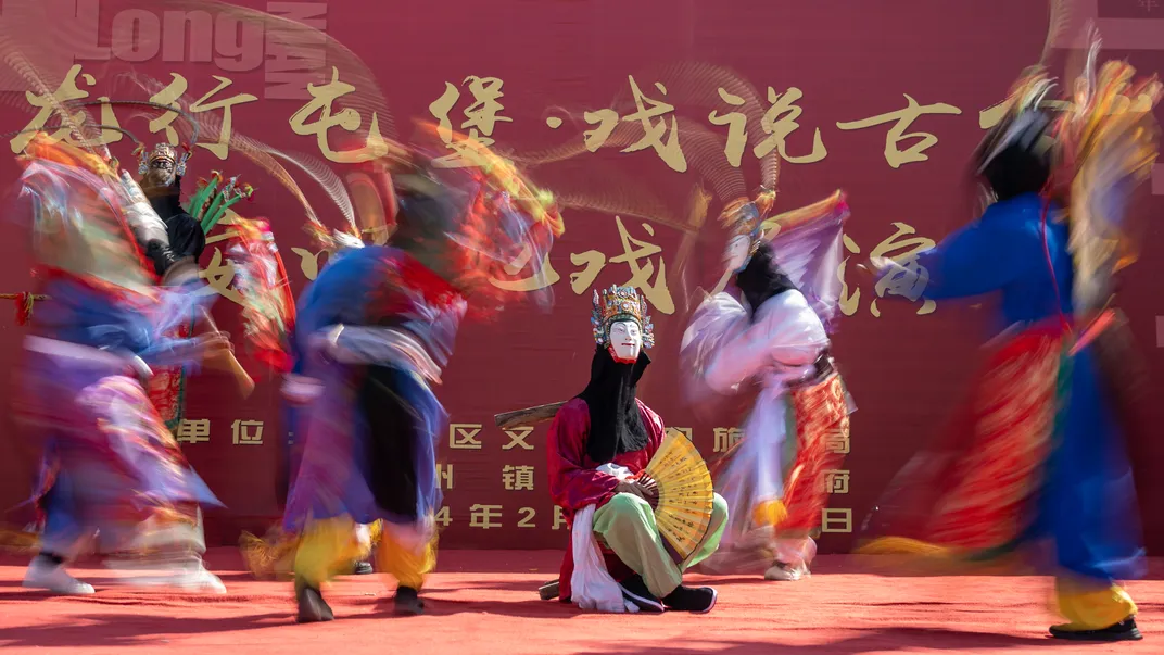 Actors wear characteristic masks and traditional costumes of the local opera in the Tunpu area of Guizhou, China. The words "Dragon in Tunpu, Tales of the Past" on the red display board indicate that this is a folk cultural performance.
