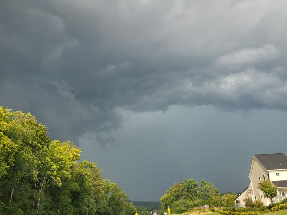 Dark storm clouds gather over the open road, creating a striking contrast between the approaching weather and the sunlit landscape still holding on.