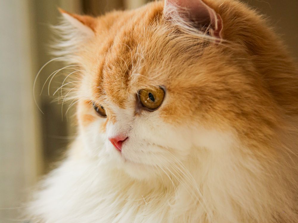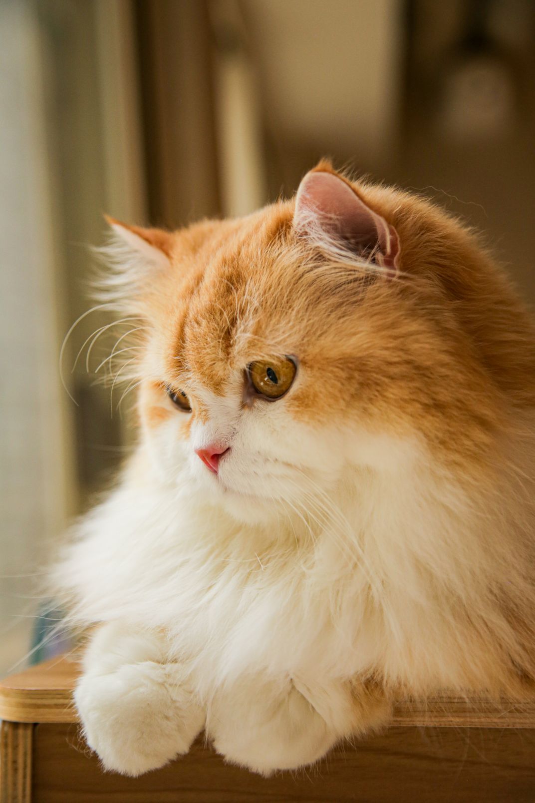 A close-up portrait of a fluffy orange and white cat resting by a window in a cat café in Taiwan. The soft natural light highlights the intricate texture of its fur and its intense, amber-colored eyes, capturing a quiet moment amidst the cafe's activity.