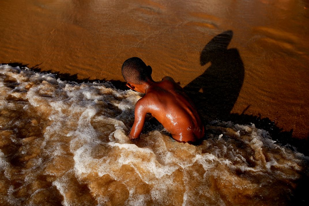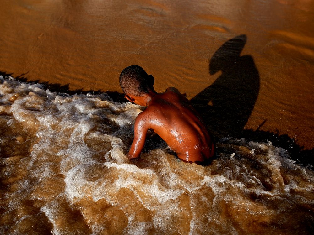 A boy plays on the beach of Porto da Barra in Salvador.