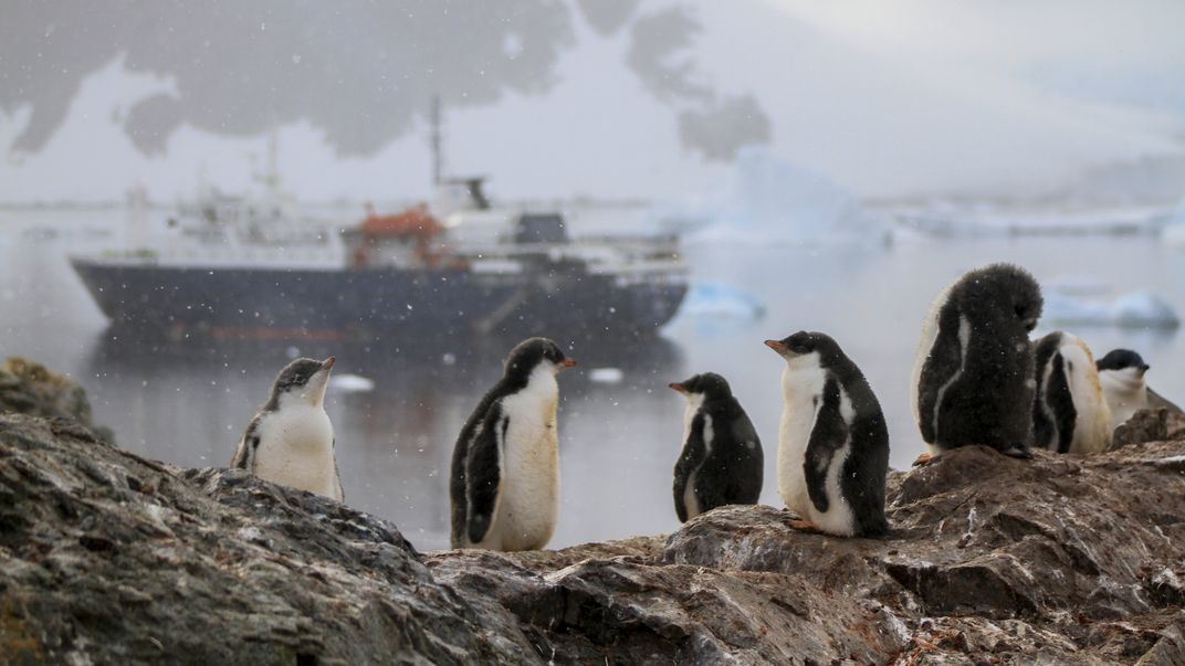 A row of juvenile Gentoo Penguins rest on a rock. In the background is the expedition ship m/v Ortelius