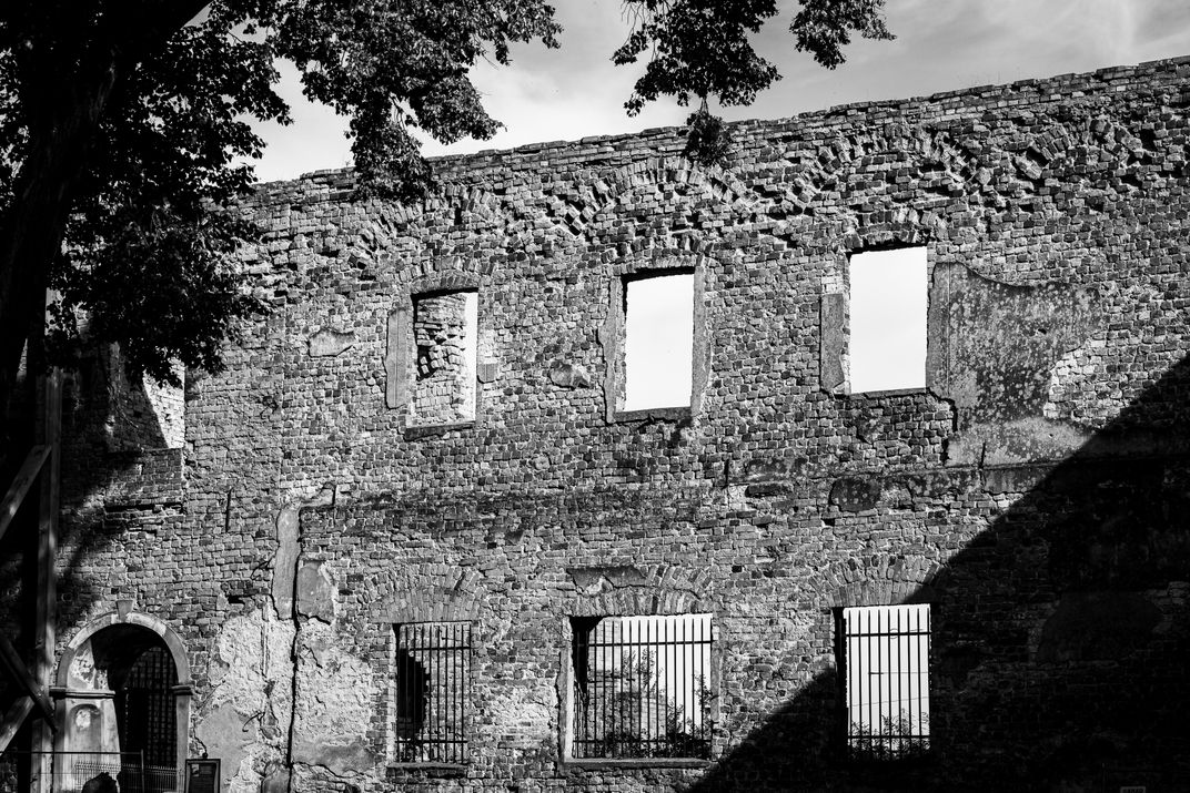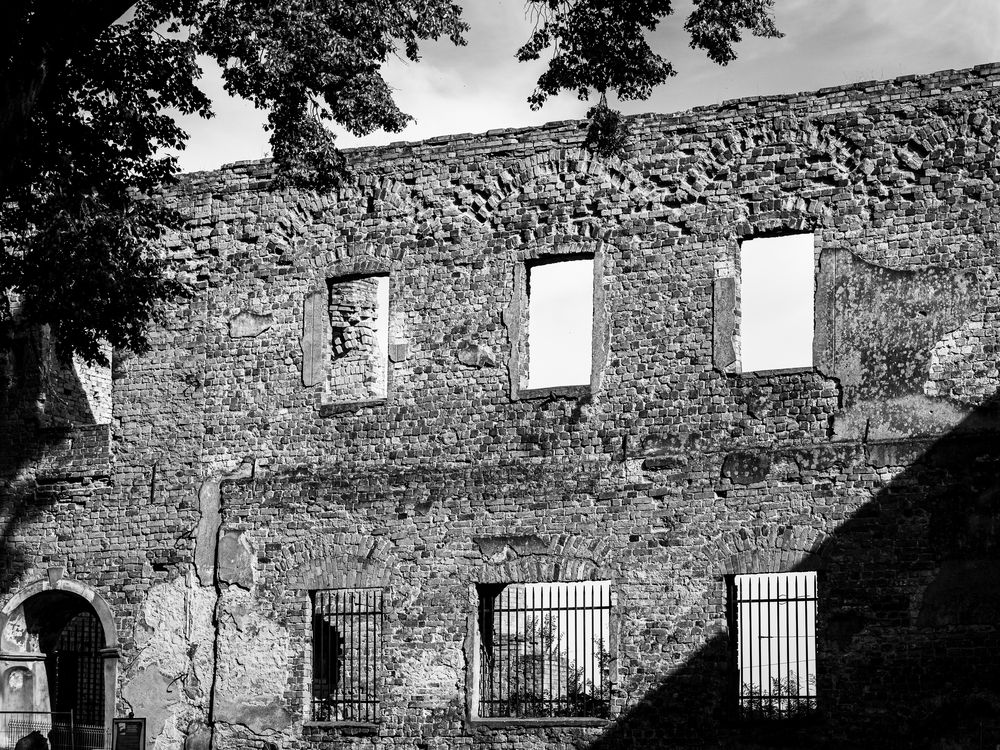 This abandoned brick façade reveals an haunting symmetry—three empty windows stare like silent witnesses to time's passage. The weathered masonry and the delicate play of light and shadow create an abstract geometry that speaks to loss, endurance, and the quiet dignity of ruins.
