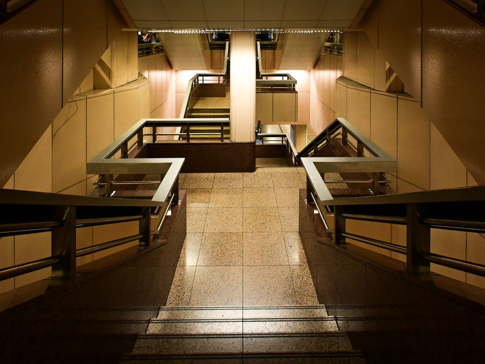 This photograph captures the staircase and handrails within a Singapore Metro station, emphasizing clean lines, geometric forms, and spatial rhythm. The composition highlights the interplay of curves, diagonals, and straight lines, showcasing the modern design and functional elegance of the station architecture. Light and shadow enhance depth and bring out the details of the materials and structural forms.