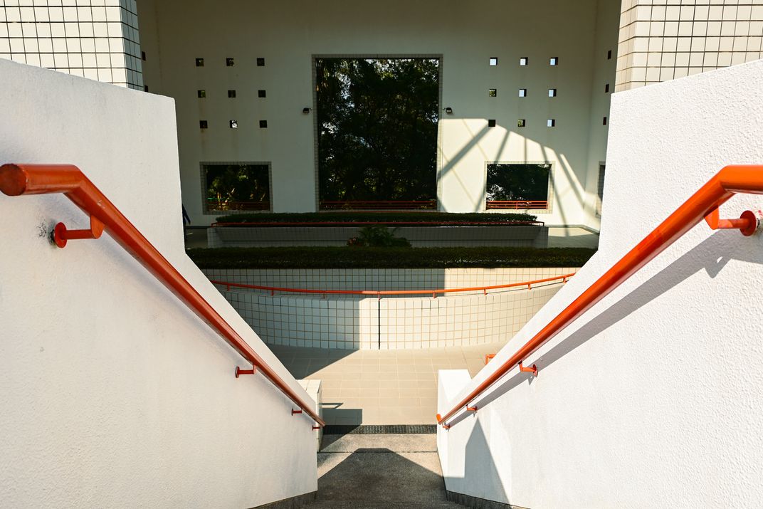 This photograph captures the side view of a white staircase along the corridor at the Hong Kong University of Science and Technology. The composition emphasizes clean lines, geometric forms, and spatial rhythm, highlighting the modernist design and minimalist aesthetic of the architecture. The interplay of light and shadow enhances depth and emphasizes the staircase’s geometric elegance.
