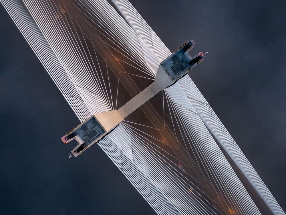 Top-down drone shot of the Rędzin Bridge in Wrocław, captured in dense pre-sunrise fog.