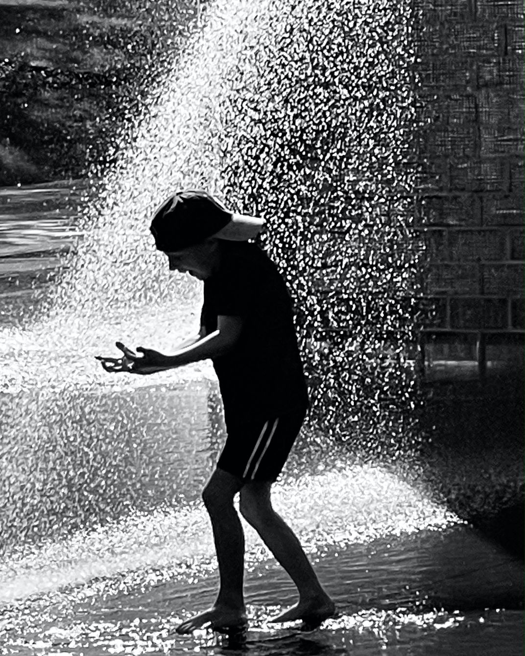 Our son and his family came from their home in Florida to visit us in Chicago just for fun. My wife and I took our grandson to Millennium Park in downtown Chicago for the morning to see the Bean sculpture and the Crown Fountain. This is him getting caught in the Fountain spray from one of the glass brick towers after running around barefoot in the large granite reflecting pool of the Fountain with many other children. His 7 year old joy is all over this photo!