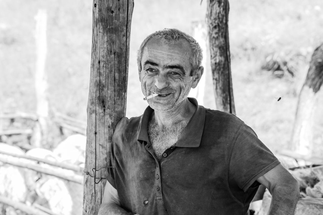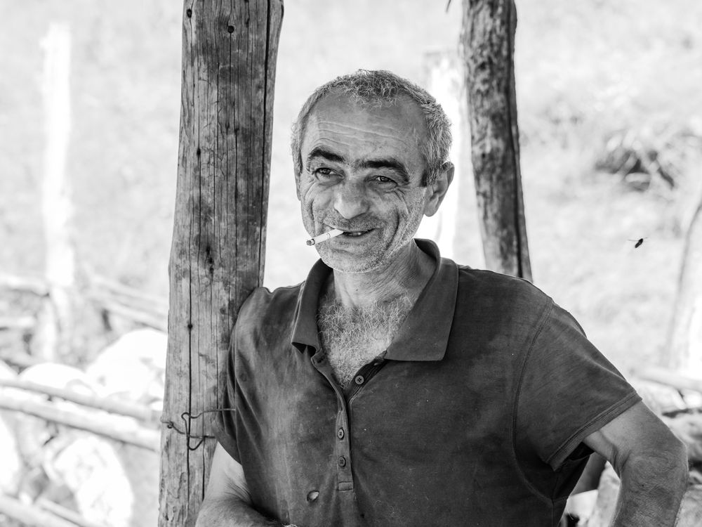 A shepherd named Vaso in the Tusheti region takes a break between sheep shearing. He stands relaxed, holding a cigarette and smiling, showcasing the simplicity of daily mountain life. The scene reflects the rugged, traditional lifestyle of the highlands in Georgia.