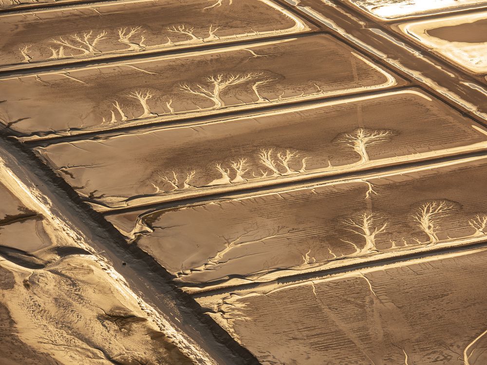 Golden light sweeps across the abandoned salt ponds of the Colorado River Delta, revealing delicate tree-like patterns etched in sediment. Captured from above while piloting my plane, the landscape transforms into a quiet, otherworldly mosaic.