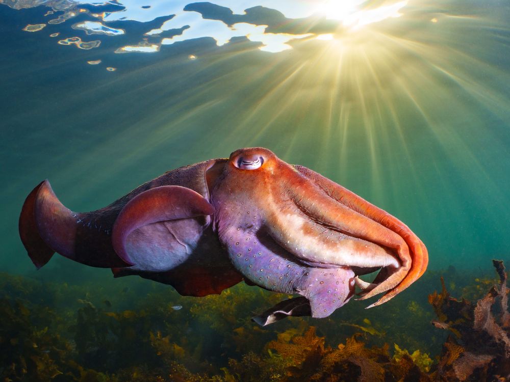 A large male giant cuttlefish pauses momentarily looking curriously at me and my camera. The later afternoon sun the perfect backdrop tothe vibrant colours of the cuttlefish.
