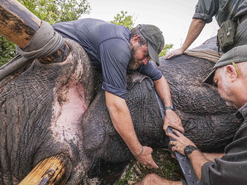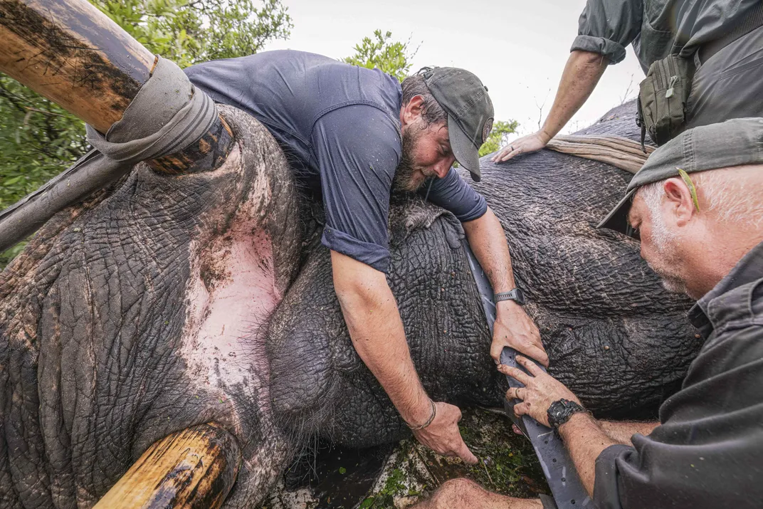 The tracking collar had come loose during the intense movement of the operation. The team adjusts it and fixes it in place, all the while the truck must move forward to get the elephant out as soon as possible. Captured during an elephant rescue and translocation in KwaZulu-Natal.