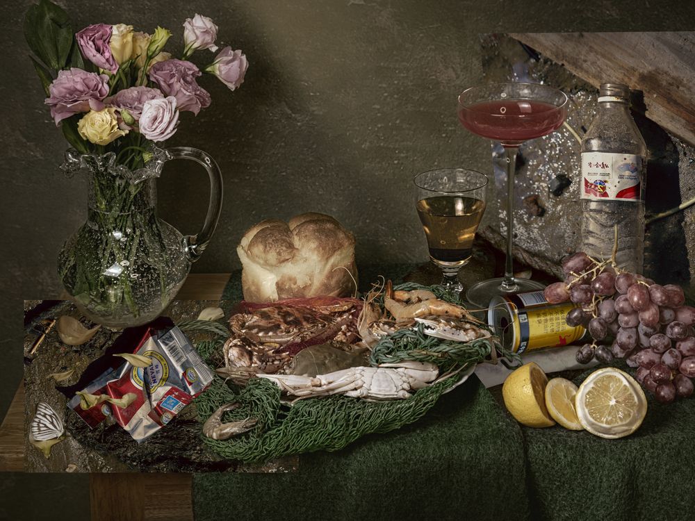 This still life work aims to draw attention to the globally concerning issue of protecting the marine ecological environment. During the creative process, I incorporated photographs of discarded items found on the beach—such as plastic water bottles, drink cans, yogurt containers, and fishing nets—into indoor still life compositions through post-production. This creates a sense of temporal and spatial dislocation that strikes directly at the viewer’s heart. The crabs and shrimp entangled in fishing nets, the mud-covered waste abandoned carelessly on the beach… The juxtaposition and substitution of these elements bring a surreal and unsettling tension to the images. Through these scenes, the artist hopes to raise awareness and provoke reflection on the importance of marine ecological protection: While we enjoy the gifts the ocean provides for us, what are we doing in return? The work calls on everyone to take tangible action—starting with ourselves—to protect the marine environment and restore a clean and sustainable home for the ocean.