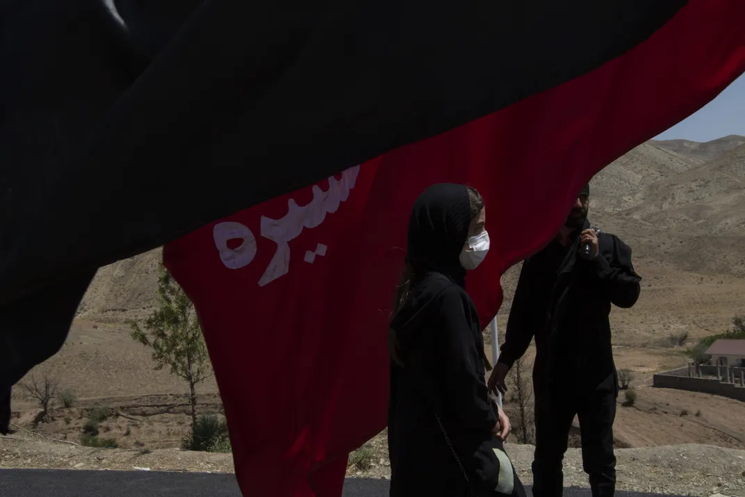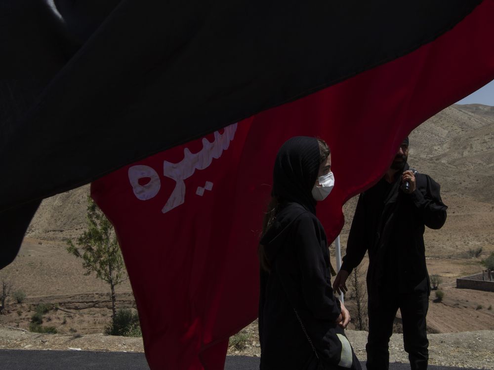 A girl with her father mourning at the Imam Hussein ceremony during the COVID-19 pandemic in Ziarat village, Damavand city, Iran