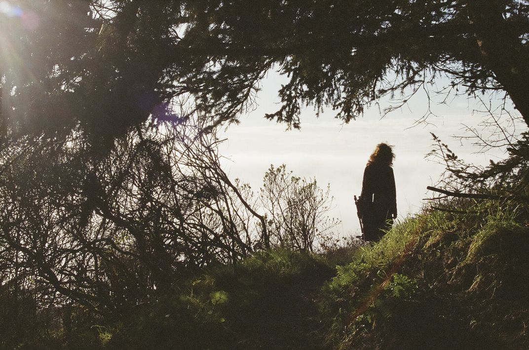 Girl exploring the unknown while gently being framed by the foliage she is walking through.