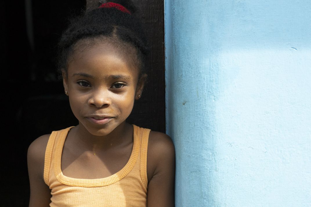 A little girl breaks away from her friends on the streets of Havana for a moment alone in her doorway.