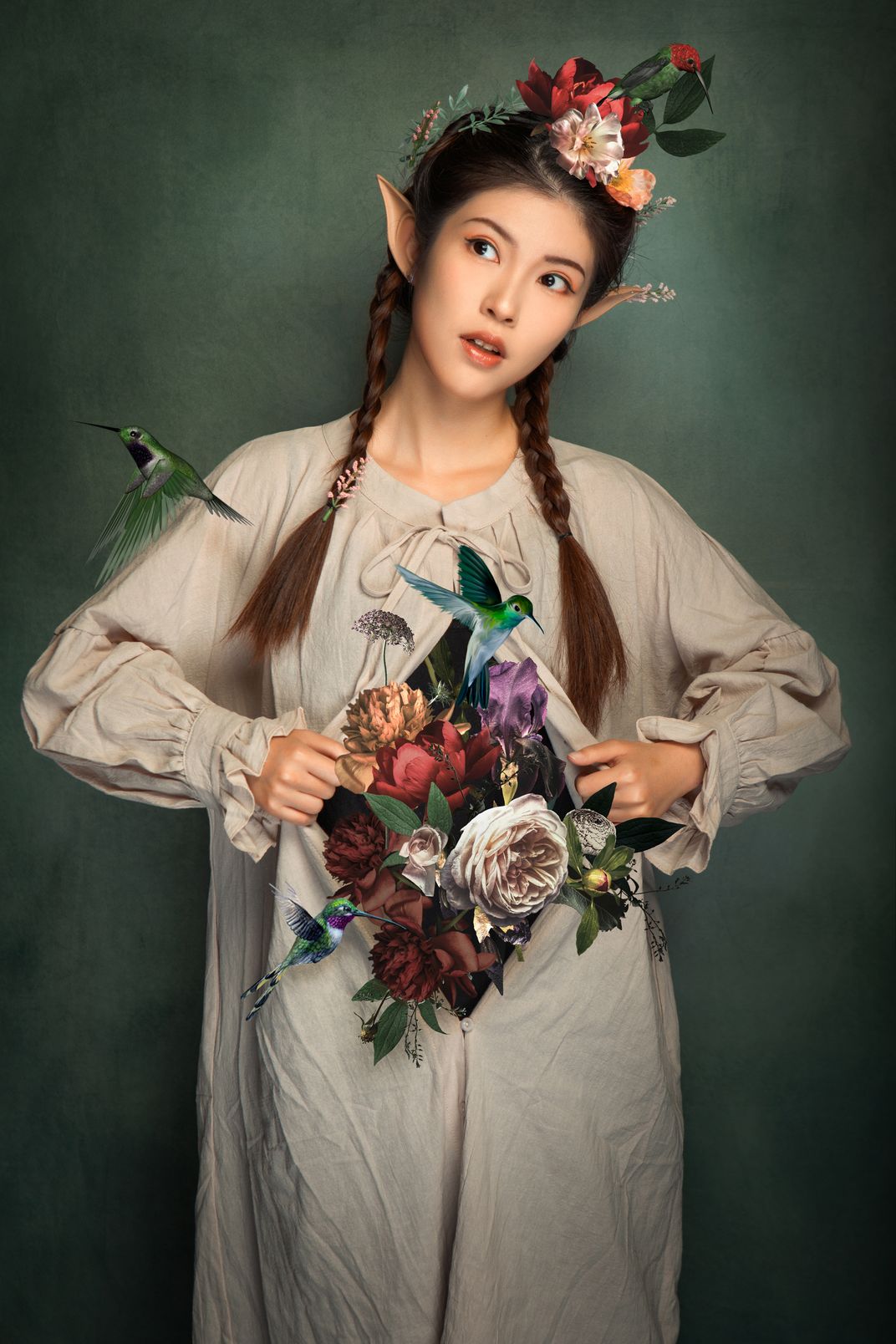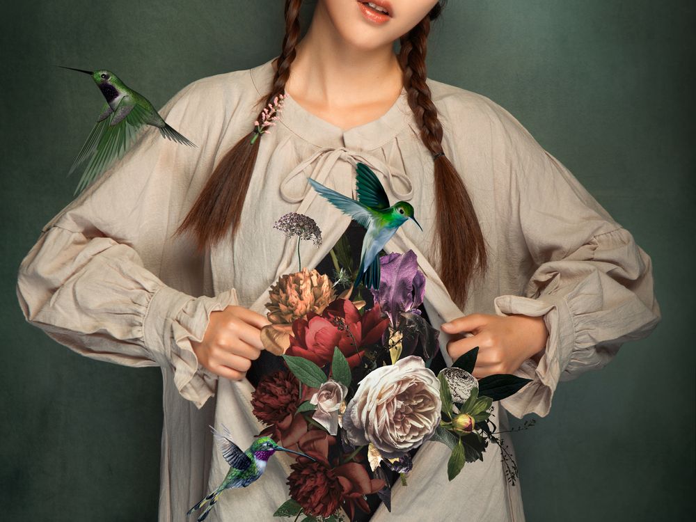 Girl with birds and flowers