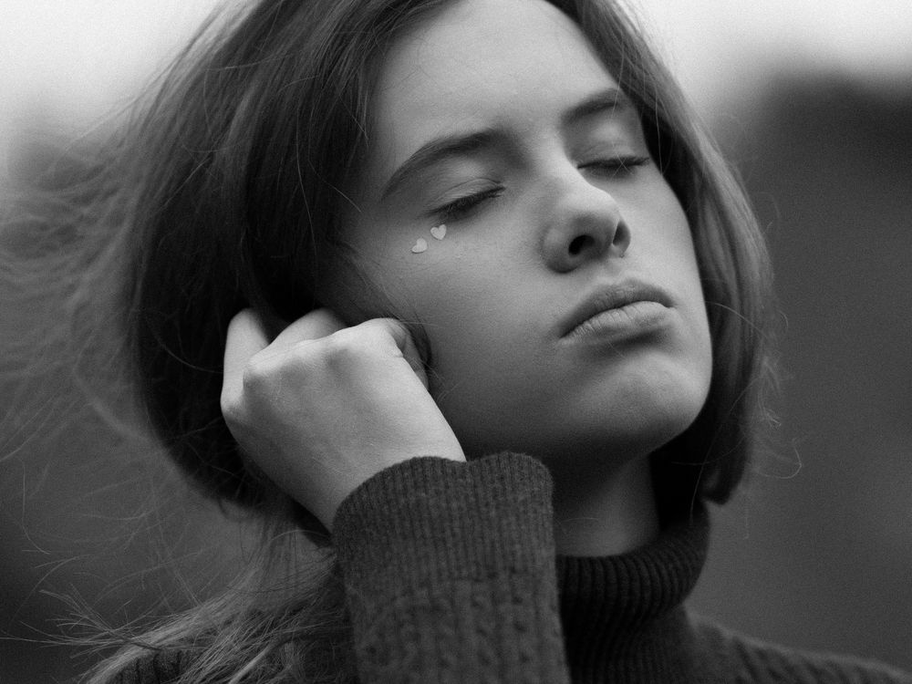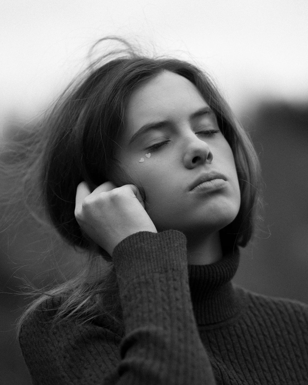 This photo shows emotion and how the wind can sometimes portray out emotions. The heart stickers on the girl's face are there for artistic and aesthetic purposes.