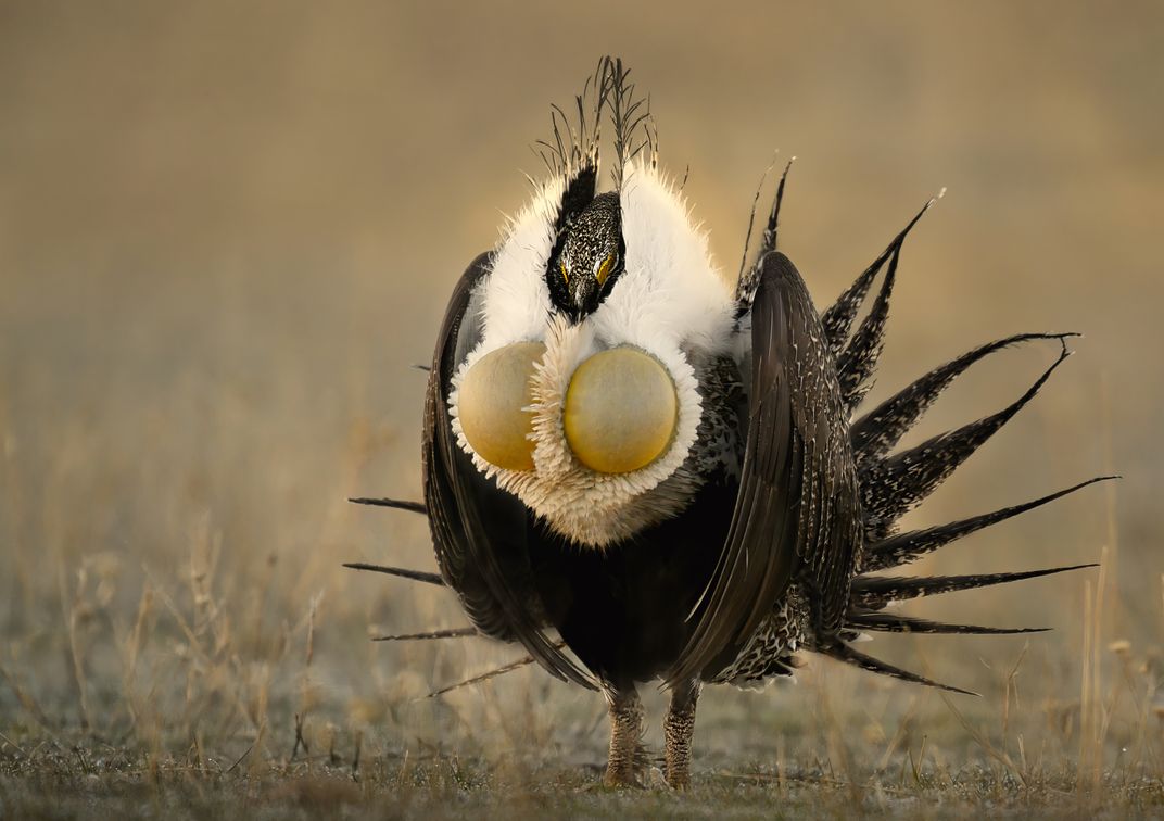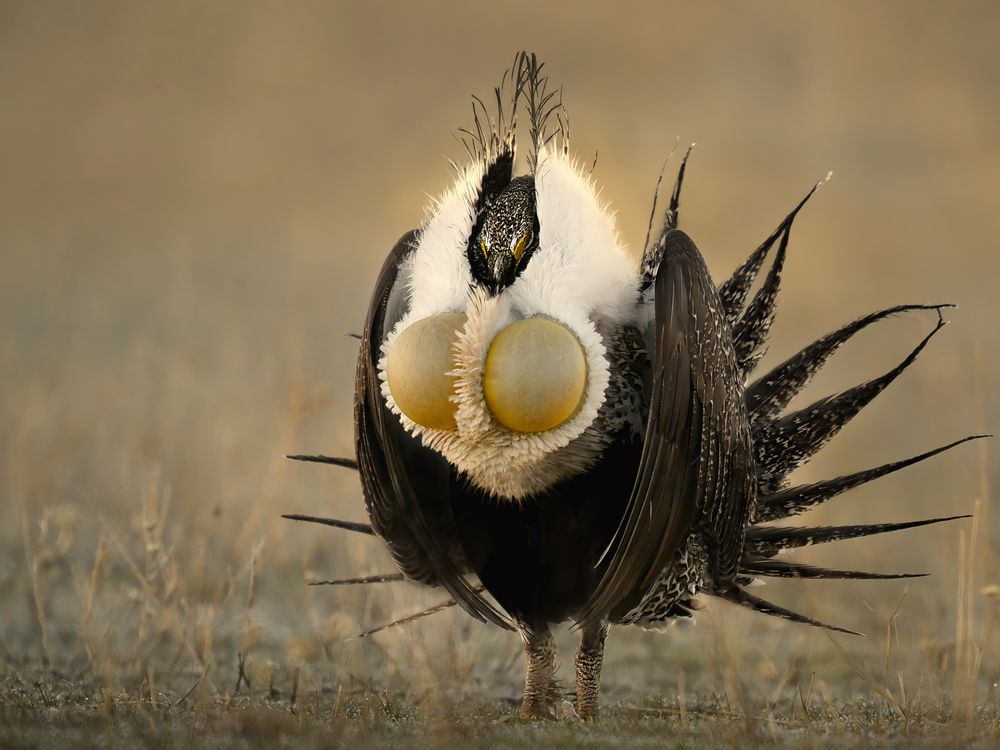 A greater sage-grouse displays on a lek, an area in which the birds congregate to mate. I photographed this male midway through his song and dance as his air sacs were completely filled, and just prior to thrusting his head upward to produce his burbling sound.