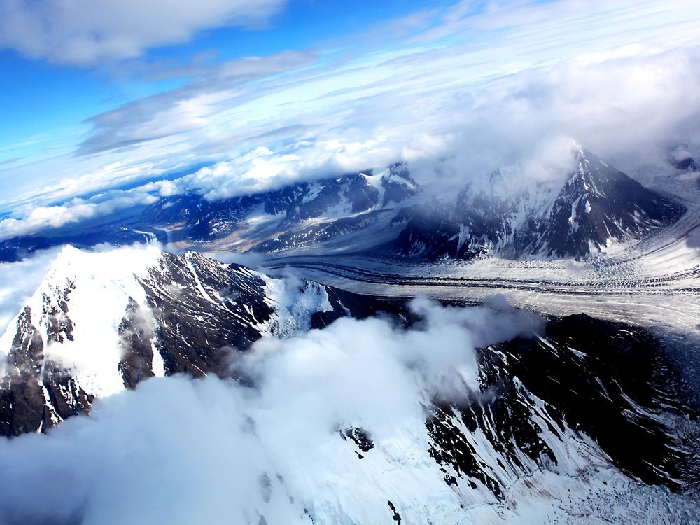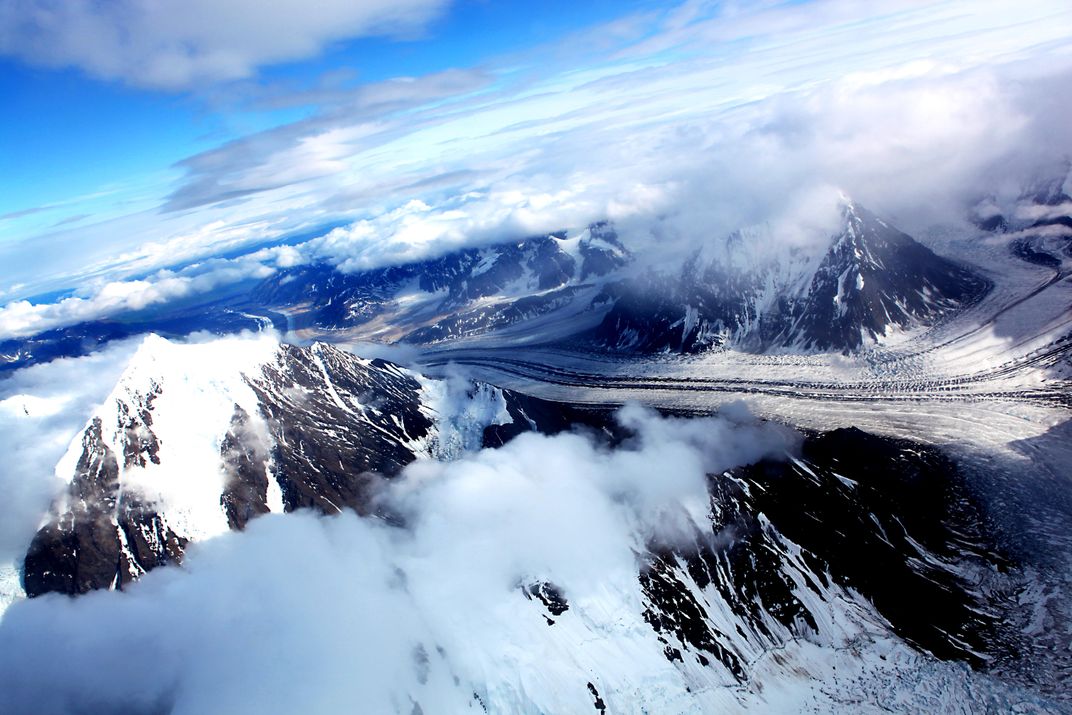 Glacier highway on Mount McKinley while flying in ski plane