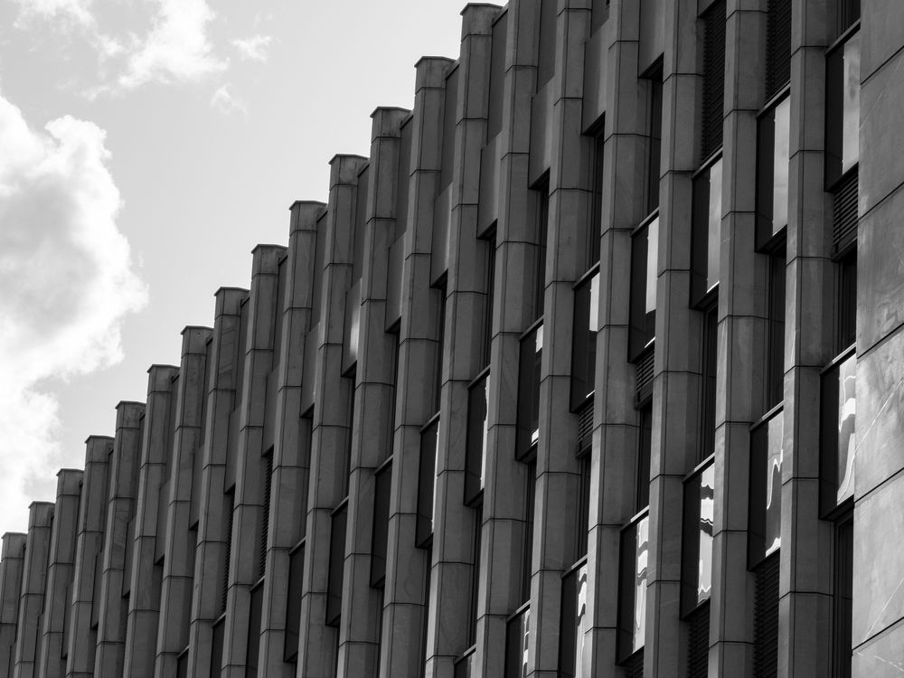 In Warsaw, a long facade of glass and concrete rises in a stepped diagonal, its repeating vertical lines catching light and shadow like a monochrome rhythm against the pale sky.
