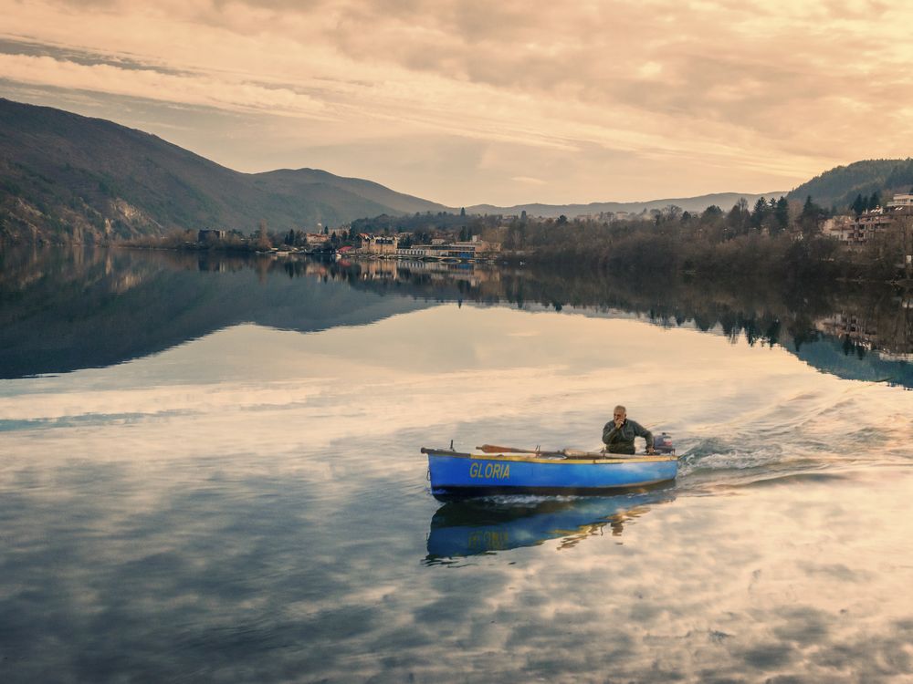 The photo shows a moving boat, steered by a man in a lake. In the background, buildings and a mountain are visible, which are reflected in the water. The clouds are also reflected. This is a collage of 2 photos. One is just a landscape, and the other is just a moving boat. The goal is to get a spectacular shot of a moving boat against a background of reflections in the water