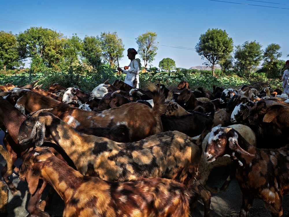 A herd of goats fills the frame in a rush of movement and earthy tones, while a herder walks alongside under the bright desert sun. Trees and hills form a quiet backdrop as pastoral life unfolds on a rural Rajasthan road.