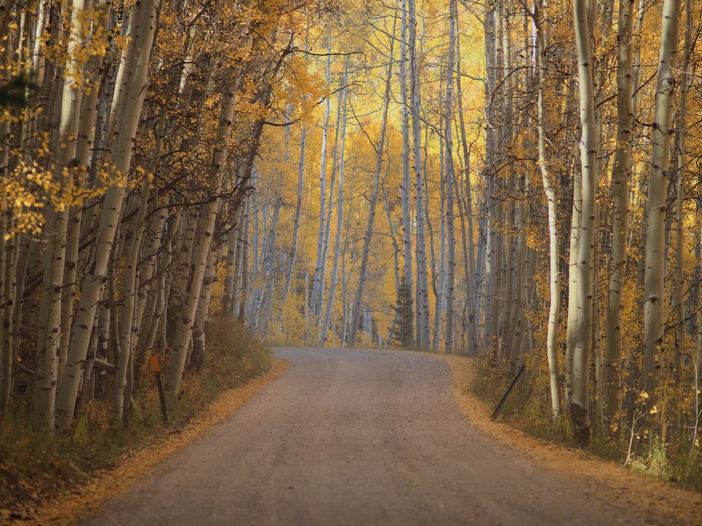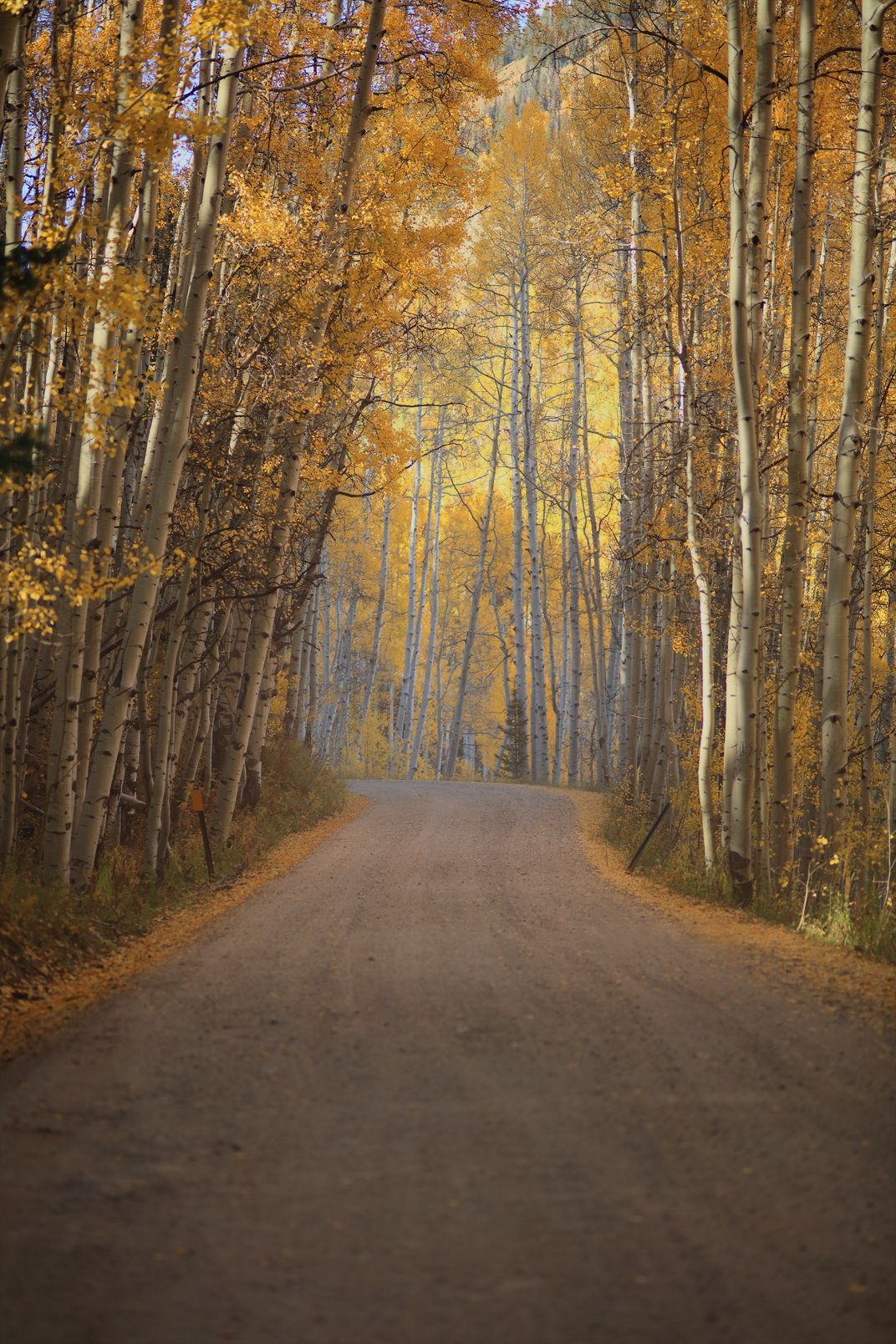 The natural gradation of the dirt road through a wooded aspen grove in the late afternoon sets the scene. While the photo passes from a dark foreground, drawing the viewer into an almost dreaming mid-ground of orange, before leading you to a bright background of yellow and out into an open blue sky. The colors and tones of this fine art photo hum softly of an autumn thanksgiving, while the road that winds through the trees, tells of a journey that hints of Going Home for the same.